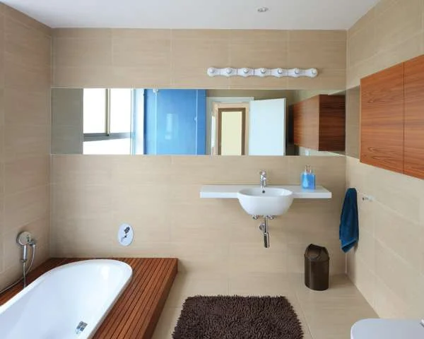 המשטח, העשוי עץ טיק שנבחר בשל עמידותו המוכחת בתנאים רטובים, נמשך "מקיר לקיר", כאשר קצהו האחד נתחם בדלתות זכוכית ליצירת מקלחון. גוון הבז' של אריחי הריצוף והחיפוי נאמן לשפת הבית, ורק חללו של המקלחון חופה באריחים כחולים- השראה מעולם הים והמים, שנשאבה מהשימוש בעץ הטיק הנחשב ל"עץ היכטות". הגינה החודרת לחלל הפנים כחלק בלתי נפרד ממנו, היא גינה "פשוטה" במובן הטוב של המילה- אינה מתיימרת להפוך לפארק טרופי אקזוטי ואינה חומדת כל חזות של מחוזות אחרים. בחזית הקדמית מלווים את הבאים צמחי שבטבטים בצד אחד, ופרחי לוע הארי שפורחים באדום עז בצד השני, ומרבית שטחה של החזית האחורית הינה מדשאה מוקפת בשיחים ובעצים הותיקים שנוסכים נועם ויזואלי ורגשי מהסוג השמור לנוף עצים ותיקים. וכך, עם עובדת קיומם שהכתיבה את סיפורו של הבית ו"הקיר התוחם" שמייצרת נוכחותם, הם גם משלימים את הרעיון שעמד בבסיס התכנון ליצור חיבור של בית וגן כמקום אחד, ולמעשה, מקומות בתוכו וסביבו, שמעשירים את חוויית המגורים בו.