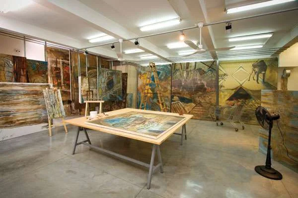 צד זה של היחידה הינו עמוק במיוחד, כך שהוא ניתן לניצול דו-צדדי: בחלל המטבח הוא מהווה חלק מרצף הארונות התחתיים, ובחלל הציבורי הוא מאכלס בתוכו אח ברזל יצוק וכן מגירות שחזיתותיהן מעוצבות בסגנון מיושן החובר לחזות האח. צד אחר של היחידה משמש כדלפק אכילה הממוקם, למעשה, במעבר לאזור הסטודיו, שחוצה את חלל המטבח וממנו נפרש לעין המרחב המרשים ורחב הידיים: עבודות גדולות ממדים תלויות על מתקני הזזה ייעודיים המאפשרים "לדפדף" ביניהן, עבודות קטנות יותר מונחות בסדר מופתי על מדפים שהותקנו לכל גובה קיר ההפרדה עם יחידת השינה, כני ציור ניצבים בפינות, ומרכז הכובד, לב לבו של החלל, הוא כמובן שולחן ענק עליו יוצרת מרקל בטכניקת ציור ייחודית לה - שילוב של חומרים כשמן, זפת או גומי, המעניקים ליצירות האבסטרקטיות מרקם נפחי.