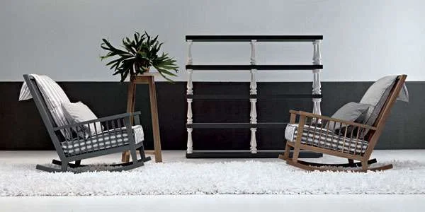 מתוך קולקציה של חב' "גרבסוני", בעיצובה של פאולה נבונה: כיסאות נדנדה עשויים עץ אגוז צבוע מעוצבים בשפה בסיסית בהשראה שוודית. "טולמנ'ס"
