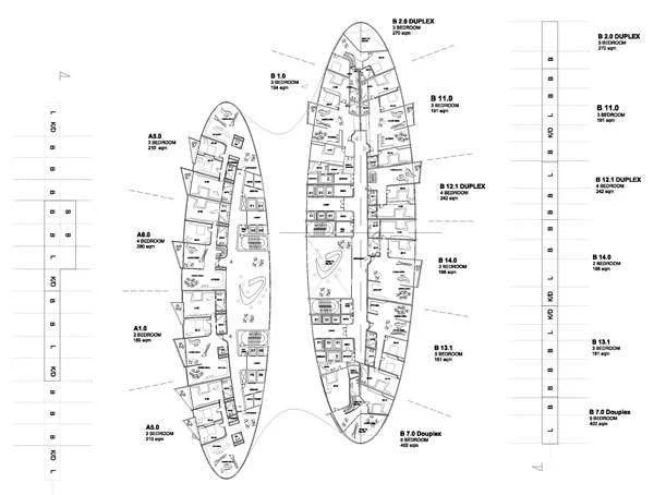 מבט על של הפרויקטהבניינים אינם מתנשאים לאותו הגובה, אך הם די מקבילים במתארם האליפטי ובסיומת הזוויתית / חתוכה שלהם ש"חודרת" באלגנטיות לקו הרקיע.