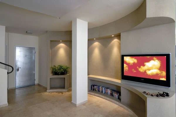 החלל הציבורי בקומה הראשונה: קיר מעוגל מחופה טיח פיגמנטי מהווה אלמנט צורני דומיננטי וסמן של ציר ההתנהלות בחלל. חיפוי טיח: "נירלט"עם מיקום יחידת ההורים בקומת הגג, נוצרה, למעשה, הפרדה בין אזורי הילדים וההורים, ועל מנת ליצור תחושת רצף בין שתי הקומות תוכנן קיר מעוגל גם בסוויטת ההורים הנוחה, שכוללת אזור ארונות, חדר רחצה ומעין מרפסת פרטית. מרפסת זו התקבלה כתוצאה מתכנון מוקפד של הגג ככלל, שנועד להפיק ממנו את המיטב, ולהעצים את יתרונות הנוף והשקט של מיקום הדירה. במסגרת זו תוכנן שטחו כשני מפלסים שחופו בדק עץ ונתחמו במעקה זכוכית עבה ללא פרופילים וללא מאחז יד, כך שדבר לא יחסום את המראה הפנורמי שנשקף ממנו. הנאה מהמראה ניתן לשאוב משתי פינות ישיבה נעימות, האחת גדולה ו"כללית", שנועדה לאירוח ו/או הסבה משותפת של כל המשפחה, והשנייה קטנה ואינטימית, ביציאה מחדר שינה, כשהן מצדיקות כל יום ויום מחדש את השיקולים שהכריעו לטובת רכישת הדירה הישנה.