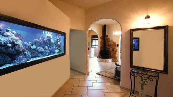 מבט אל הסלון ופינת העבודהבשפת העיצוב בולטים שני מוקדי עניין ייחודיים - אקווריומים מרשימים הנוסכים בחלל הדירה ממד רב קסם ואווירה. האחד, המקבל את פני הבאים היישר בכניסה, הוא אקווריום מים מלוחים, כעין "מיני" ריף אלמוגים ששובה את העין בהציגו פיסת טבע מרתקת. לצורך שילובו, מספרת מרקו, תוכנן הקיר המפריד בין המבואה וחדר השינה עם מעין "בטן" (חלל עמוק/גומחה) ייעודית להכלת כל מערכות החיים והתפעול שדורש אקווריום דוגמת זה. "הבטן" פונה לחדר השינה שם סוגרות על פתחה דלתות הזזה עשויות זכוכית בידודית כפולה שנועדו להבטיח אטימה אקוסטית, ומעבר לערך הפונקציונאלי תורמות ערך אסתטי אוורירי.