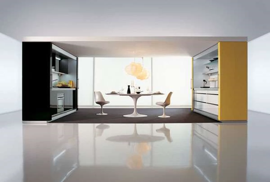 מטבח בעיצוב סלוני וגווני שחור לבן, חובר לחלל המגורים כחלק בלתי נפרד ממנו. ניתן "לשחק" עם מיקומי היחידות השונות. "Effeti" (בארץ: מטבחי זיו).