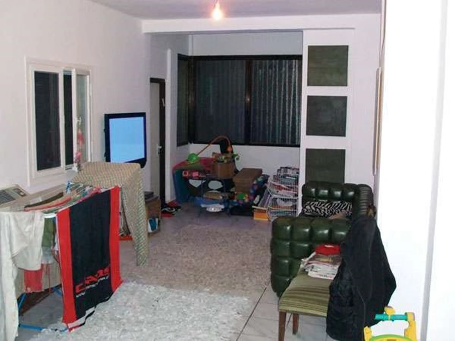 אחרי- החלל הציבורי שהינו צר וארוך חולק לשני אזורים סלון, ומטבח +פינת אוכל. לקיר הארוך שמלווה את החלל הארוך (12 מטר) העניק לאור מראה של לבנים ישנות באמצעות שליכט צבעוני שנמרח על שבלונה בתצורת "לבנים" בעזרת מסקינטייפ שהודבק בשתי וערב והוסר לפני הייבוש הסופי של השליכט.