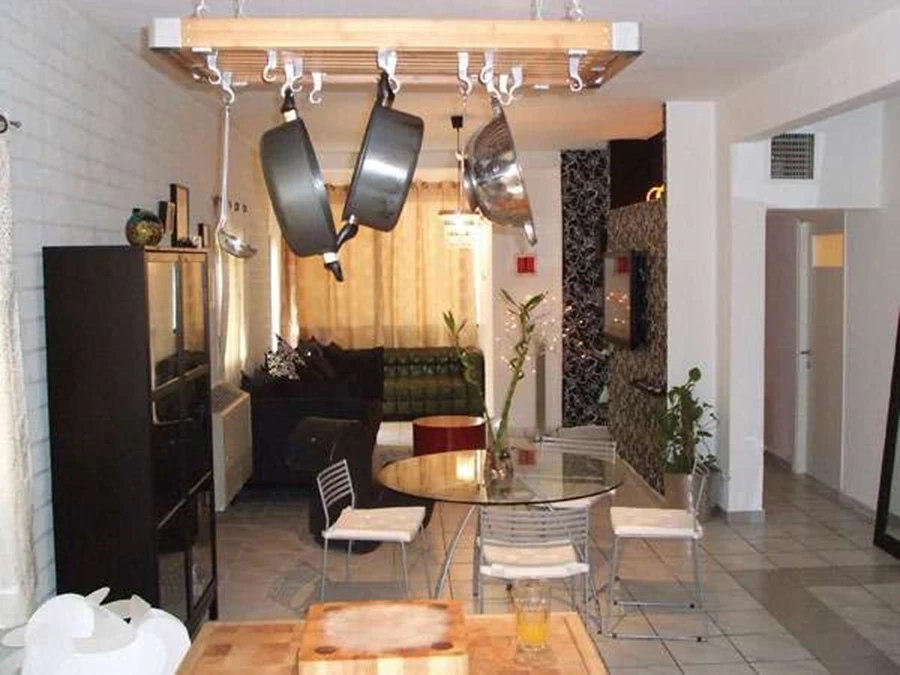 במטבח הוצבה יחידת אי ניידת מעץ מלא, ומעליה נתלה מתקן לסירים המשתלשלים מהתקרה ומקנים מראה ביתי וחמים. מאחורי האי, בצמוד לקיר, הונחו סלסילות ירקות, כאשר הנחתן באלכסון מזכירה את סידור הארגזים בשוק - גם פרקטית מאד, וגם סוג של "קטע" מקורי.