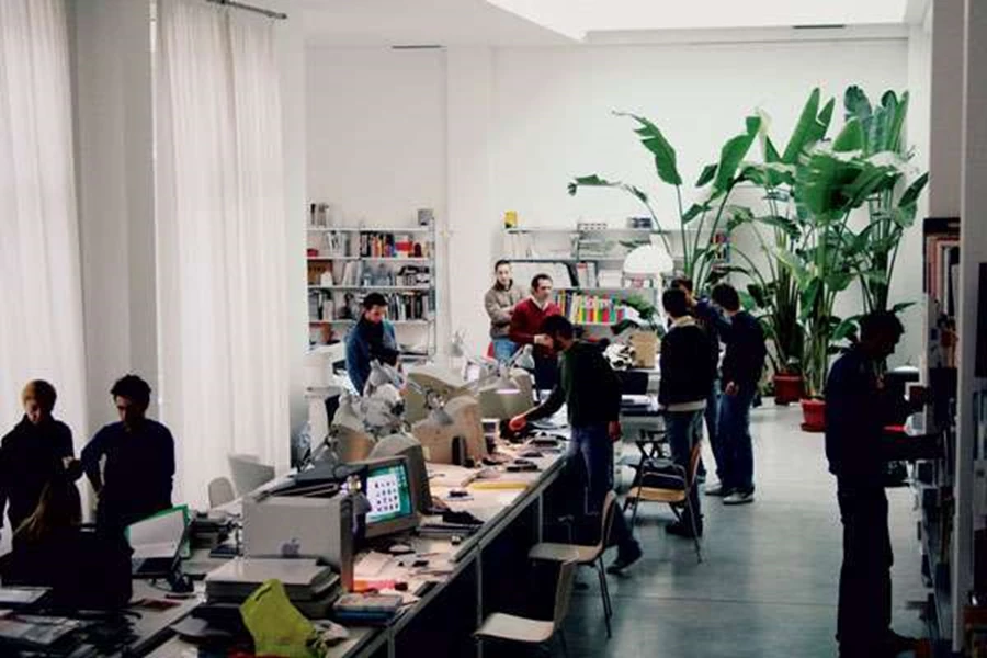 בחלקו האחד ממוקם שולחן עבודה ארוך מאד, שמשני צדדיו, כמו היו מסבים לסעודה, ישובים אנשי הסטודיו- אדריכלים ומעצבים, ולמרות שכל אחד מרוכז במחשבו האישי, האווירה היא אווירה טובה של עבודת צוות פורייה. במקביל לשולחן, לאורך כל הקיר ובצמוד אליו, נמשכת ספריית מדפים לבנה המכילה כמות עצומה להתקנא של חוברות וספרי עיצוב, ובסופו, באזור החלל הגבוה, ישנו שולחן רבוע המיועד לישיבות ודיונים. אל השולחן "רוכן" גוף תאורה גדול, Tarassaco, בעיצובו של קסטליוני, ולצדו ניצבים עציצים גדולים שהאור החודר מבעד לתקרה השקופה ממעל מיטיב עמם, כשהוא גורם לעליהם לצמוח לממדים מרשימים, כמעט ללטף את הקומה השנייה. בחלקו השני של החלל, על הצלע השנייה של מתאר ה-ר', ממוקמים שולחנות העבודה של לודוויקה ורוברטו, ולא פחות חשוב- הספה הכתומה של כלבי הבית האהובים, הרובצים עליה בתחושת בעלות מופגנת.