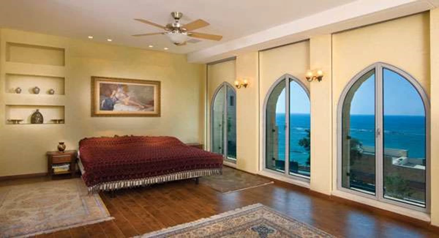 יחידת השינה המרווחת מרוצפת בפרקט, ואינה מקופחת מבחינת הנוף החודר אליה מבעד פתחים גדולים ומקושתים שמצטטים את המוטיב המקומר.