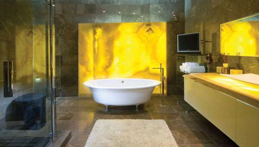 חדר הרחצה של יחידת השינה: מרווח, מפנק ומרשים בעיצובו הדרמטי משהו. בעוד מהלכו הראשון הוא ישר ו"רגיל", המשכו המתעקל מטה מפתיע לחלוטין, כאשר החלל המרווח של הקומה העליונה מתחלף בתמונת כוכים מקומרים בנויים אבן, המעניקים תחושה כלשהי של הימצאות במערה. אזור זה, שהינו, למעשה, תמצית העבר ונקודת המוצא המשמעותית של התכנון, מהווה מעין מבואה של הקומה, בה מצוי פתח כניסה לחדר אחד וממנה מוביל מעבר קצר ליחידת שינה מרווחת הכוללת חדרי רחצה וארונות. פתחי הקומה התחתונה אינם מקפחים אותה מבחינת הנוף, והם תוכננו כפתחים גדולים שעיצובם המקושת מייצר רצף רעיוני-ויזואלי עם המבניות הקמורה.