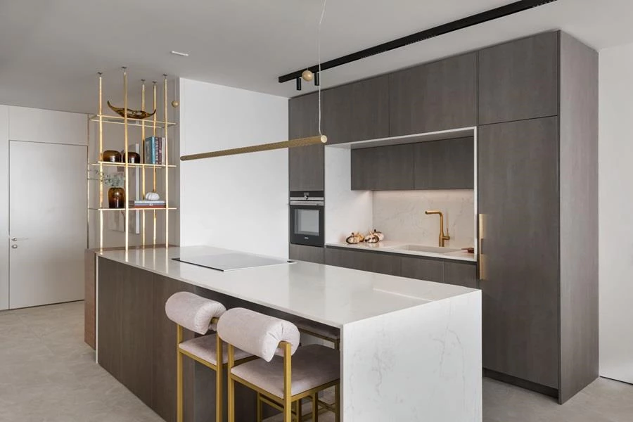 "הספרייה היא גם זו שמגדירה את ראשיתו של המטבח הפרללי, שם תוכננה חזית גבוהים בגוון גרייז' מתכתי שצבעה משתנה לאורך היום על פי עוצמת האור. ויתרנו על פינת אוכל פורמלית ובמקומה שיבצנו קונזולה בגב הספה שבסלון, שנפתחת על פי דרישה לכדי שולחן אוכל מרווח וגדול. כיסאות האוכל נמצאים בחדר האורחים שם יצרתי בגומחה קיימת אזור לאחסון חפצים גדולים ומאסיביים".