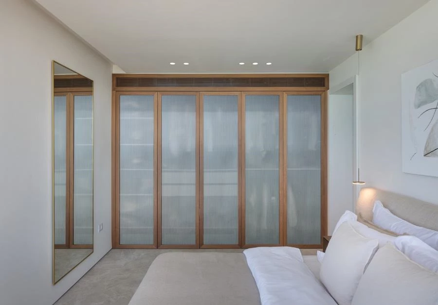 בין האגף הציבורי לאגף הפרטי חוצץ קיר נגרות בגוון חולי מעוטר בפסי פליז דקיקים שמדגישים את מימד הגובה ובחלקם משמשים כידיות לדלתות החדרים. בחדר השינה יצרנו מפתחים מקסימליים ובאישור קונסטרוקטור גרענו חלק מהקיר הקיים והשלמנו את החלון המקורי לכדי חלון פינתי- כך כששוכבים במיטה, ניתן להנות מזווית פנטסטית נוספת לים. השתדלנו ליצור מראה מינימליסטי ופרט למיטה ולצמד שידות לילה יצרנו ארון בגדים מקיר לקיר מוקף מסגרות עץ אלון בתוכן שיבצנו מילואת זכוכית מאסטר ליין עם פסים שממסכת את תכולת הארון ומייצרת תנועתיות שמתמזגת עם זו של הים".