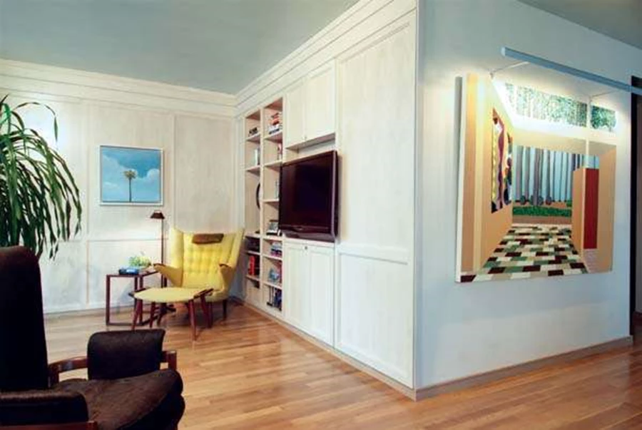 הסלון- חיפוי קיר בגימור עץ בחלוקת פנלים זהה לחלוקת החלונות, ושתי גומחות שתוכננו בתוכו: גומחה המשמשת כספרייה וגומחה לאכלוס מסך הטלוויזיה.בשלב הראשון שינתה דניאל את חלוקת החלל הנתון שמשתרע על 1300 sq ft, ואשר במקור כללה סלון, מטבח, סוויטת שינה ושני חדרים קטנים נוספים (ראה שרטוטים של התכנית המקורית ושל החלוקה החדשה). סוויטת השינה נותרה כשהייתה במקור, ועיקר השינוי המבני בוצע בחללים האחרים. חלל הסלון הוגדל על חשבון ביטול חדר קטן שגבל בו, ובתוך כך נוצר מרחב בעל זרימה פינתית שבאופן טבעי מחלקת אותו לשני אזורים. חדר השינה הנוסף הוסב לשמש כחדר עבודה ואירוח בעת הצורך, והוא כולל בשטחו חדר רחצה צמוד.
