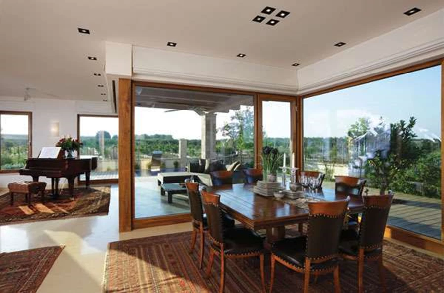 פינת האוכל התחומה בויטרינות שמאפשרות למסבים בה ליהנות מנוף השדות, ובתוך כך גם לנהל קשר עין ישיר עם פינת הישיבה הממוקמת ברחבה החיצונית. שולחן: "מדרה"