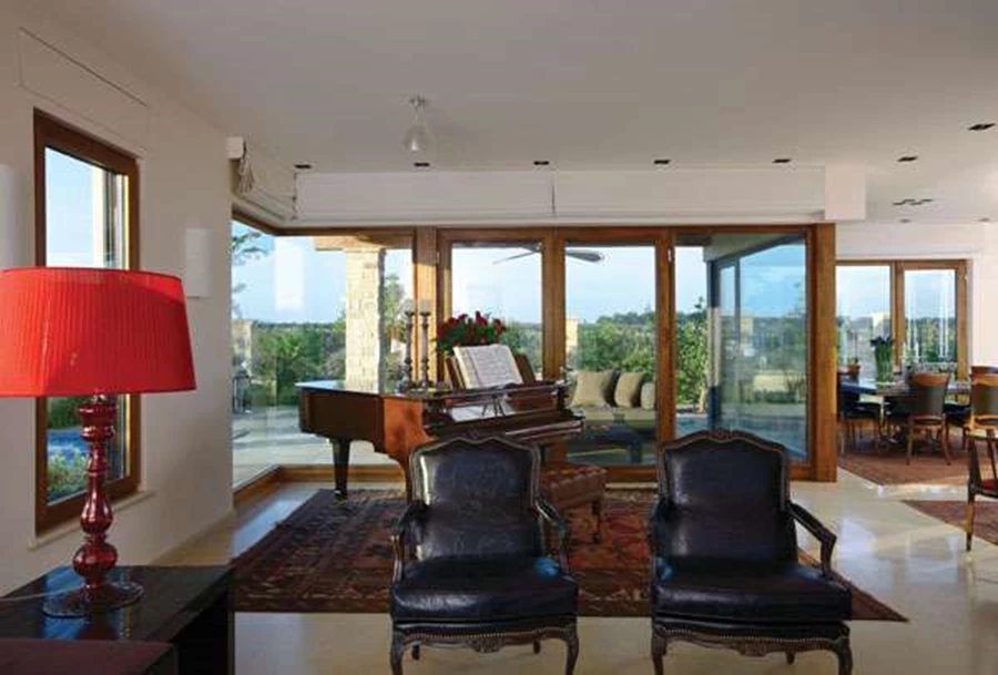 מבט מעומק הסלון לכיוון החלל. מבעד לויטרינות הגדולות נשקף נוף השדות, וזרימתו הפינתית של החלל מחלקת אותו באופן טבעי לשני אזורים.