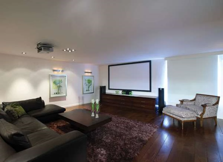 חדר הקולנוע שביחידת המרתף המוקפת חצר אנגלית, ערוך כהלכה לצפייה בסרט טוב ממעמקי מערכת ישיבה מפנקת. מערכת ישיבה וכורסה: "רוש בובאה" חומריות הפנים חמימה, זהה במידה רבה לחומריות החוץ ומייצרת אגב כך קשר והמשכיות ויזואלית: ריצוף באריחי אבן חלילה, קירות בגון- Victorian white, שהינו כמו לבן שהתיישן ו"עובד" היטב בתנאי תאורה טבעית ומלאכותית, מסגרות עץ (גון אגוז) ואלומיניום (גון חום אדמה) בפתחים, ושימוש בלבני פירוק לחיפוי קיר גרם המדרגות. גון האבן הטבעי של הלבנים משולב בניואנס ורדרד כלשהו ונוכחותן ככלל, מעשירה את המרחב באווירה ובערכי התוכן שהן מגלמות.