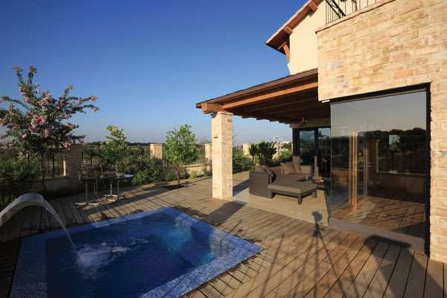 אזורי שהייה נעימים בחזית האחורית: פינת ישיבה מקורה בפרגולה, משטח מרוצף דק שבתוכו משוקע ג'קוזי מפנק. ריהוט גן: "Kettal" מבית "פיטרו הכט"הסגנון בכללו הוא אלגנטי, נרקם מפריטי ריהוט בעיצוב נקי לצד פריטים עתיקים או כאלה שמגלמים זיקה למראה כזה, כאשר יצירות אמנות מקוריות, שטיחים אתניים איכותיים ופריטי נוי שלוקטו בקפידה מייצרים מראה מדויק מאד, הרמוני ואנין בשילוביו. "זהו בית מפנק. במרחב המחייה שהוא מספק, במענה לצרכי נוחות ופרטיות שהוא מעניק לדייריו, ובמערכות החכמות שמקלות על תפעולו (בית חכם)" אומר טל, והפינוק הזה בא לידי ביטוי גם בגינה הסובבת אותו, שמציעה את אותן איכויות אסתטיות ופונקציונאליות, ואת אותו מענה לצרכים שונים: פינת ברבקיו לא פורמלית שמשמשת בעיקר את בעלי הבית, רחבת ישיבה מחופה בפרגולה לאירוח ביציאה מהסלון, ג'קוזי מחופה פסיפס שתוכנן כבריכה שקועה, פינת ישיבה אינטימית בסגנון בר, וכמובן רחבת הכניסה המלבבת.