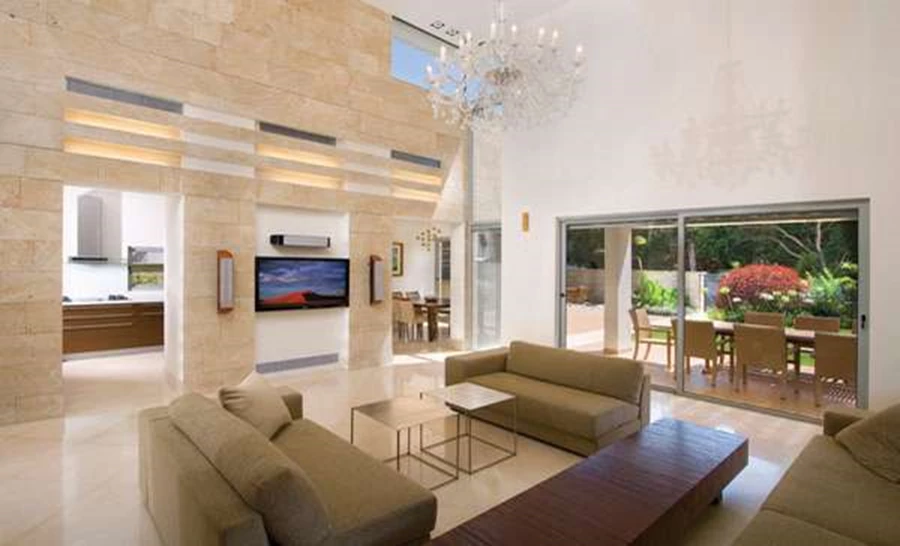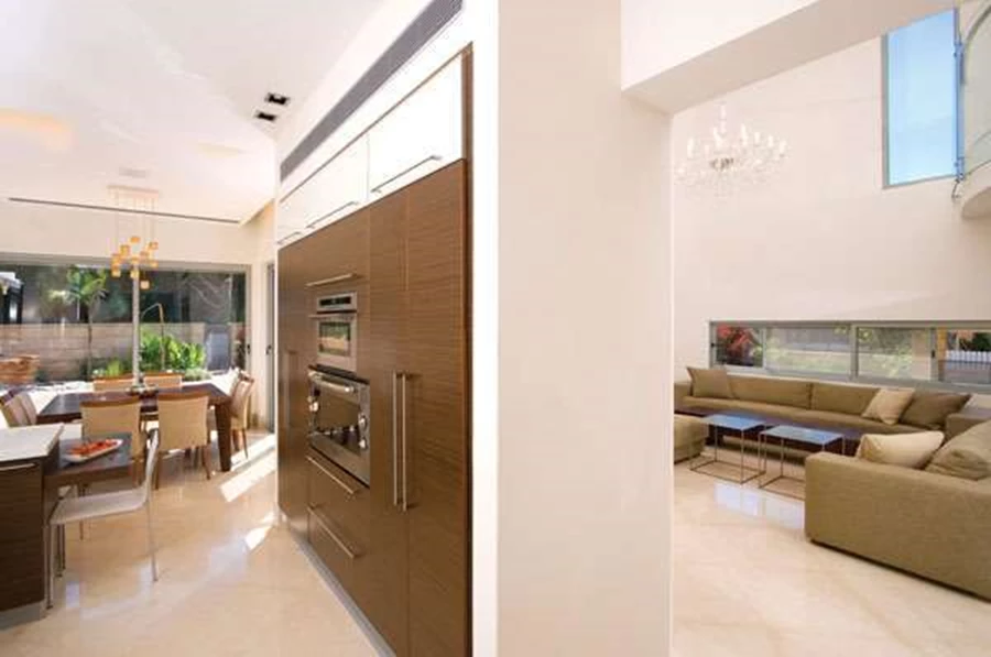 מבט לחלל הציבורי מכיוון הכניסה. אזור המטבח ופינת האוכל ממוקמים בתוך קובייה עצמאית מחופה אבן כורכר מנוסרת. גופי תאורה שקועים: 'תומס תאורה'. חלל זה הינו המפרק המחבר בין הגושים, ובתוך כך אף מסמן את חלוקת מרחב הפנים: אגף ציבורי הכולל סלון, מטבח ופינת אוכל מימינו, ואגף פרטי המשתרע על שתי קומות, משמאלו. "את התנועה בבית מייצרים צירים" מסביר דבוריינסקי "ציר רוחב שזורם "מקצה לקצה" בקומת הכניסה (מהרחבה המרוצפת של הסלון עד פינת טלוויזיה באגף הילדים), כשהוא קושר את החללים הציבוריים של אגפיה בקשר עין ישיר וממשיך אף החוצה בפיתוח השטח; וציר אורכי, פרטי, שמחבר בין חדרי השינה וצופה לפטיו".