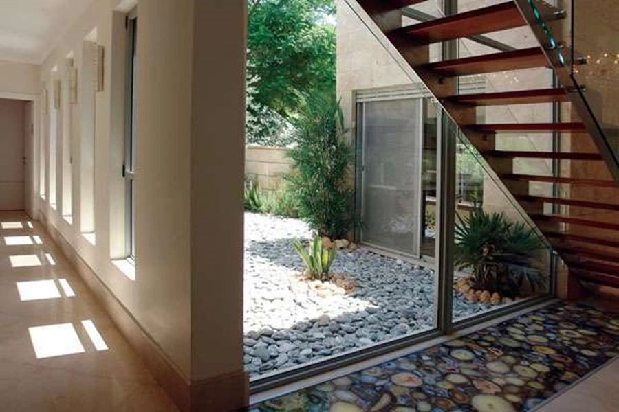 האיפוק המאפיין את החזית הקדמית, "נשבר" עם פתיחת הדלת שחושפת מבואת כניסה מרווחת בחלל גבוה, ומפתיעה עם "מיצב" של ממש: קיר מסך גדול דרכו נשקף פטיו חיצוני מרוצף חלוקי נחל, גרם מדרגות אוורירי שכמו זורם על פני שטחו באלכסון, ואלמנט תאורה רצפתי המשולב תחתיו, כשמרקמו דמוי חלוקי הנחל יוצר אשליה של רצף חומר וצורה עם ריצוף הפטיו.