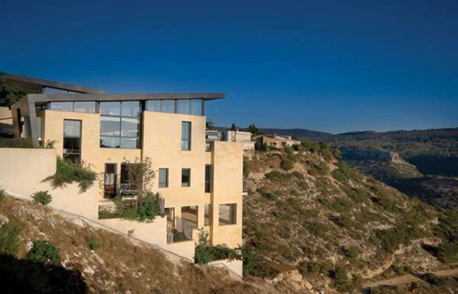 מבטים משני צדי הבית - מבנה ה"צומח" מתוך השיפוע ההררי עליו הוא בנוי. דירוג של שלוש קומות ומעטפת המורכבת ממסות בנויות שקטעים שקופים מחברים / מנתקים אותן. הגג המרחף נתמך על ידי עמודי פלדה הצומחים מתוך המסות הבנויות, ובאזור החזית "גולש" מטה תוך יצירת שכבה בנויה נוספת בקדמת המעטפת. המרווח בין שתי ה"שכבות" מנוצל להתקנת תאורה.