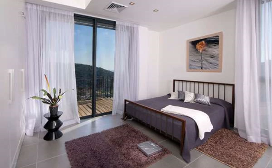 יחידת שינה בעיצוב מינימליסטי העוקב אחר גווני האפור.