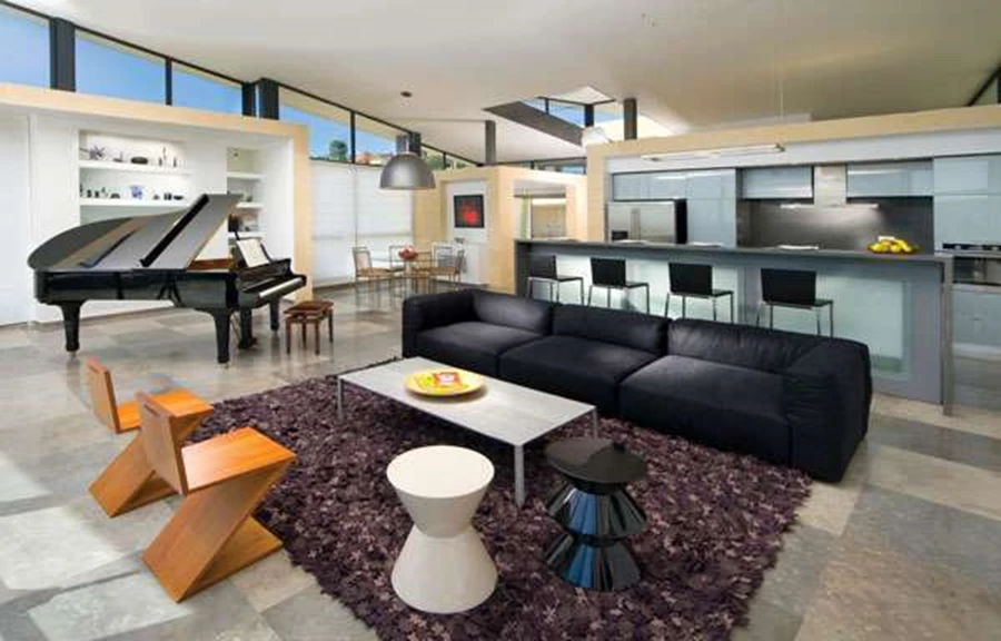 הכניסה לחלל הפנים חושפת מרחב פתוח ומלא עוצמה, גבוה ומואר, ש"מגלה טפח ומכסה טפחיים" - מאפשר למבט לחצות את כל אורכו ולפגוש את יפי הנוף, ועם זאת כלל המרחב אינו מתגלה באחת, אלא רק ככל שמתקדמים פנימה, כאשר ציר הכניסה מסמן את אזוריו השונים: מימינו ממוקמת פינת האוכל, משמאלו המטבח הפתוח ואזור הישיבה הסלוני, ובתווך ניצב פסנתר כנף גדול ומרשים המשרת את הבן הבכור בקריירה המוסיקלית שלו. "הפסנתר מעיד, למעשה, על אופיו של החלל שביקשתי ליצור" אומרת פישר-גבירצמן "מרחב פתוח ללא כל מחיצות הפרדה, שמאפשר לכל בני הבית להימצא בו יחד גם אם כל אחד שקוע בעיסוקו הוא - נגינה, צפייה בטלוויזיה, בישול, או עבודה מול מחשב נייד".