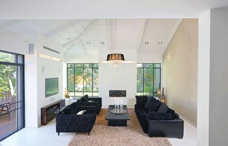 החלל המרווח בצדו השני של אזור המבואה מכיל בשטחו את המטבח ופינת האוכל, והסלון ממוקם מהלך שתי מדרגות נמוך ממישור המפלס- חלל גבוה ורחב ידיים מקורה בתקרת עץ משופעת. בחלל זה ניצלה גונן את הרחבת פתחי המעטפת ל"עיבוי" הקירות המפרידים ביניהם, ורתמה אותם לטובת שילוב אלמנטים שתכננה: בקיר אחד שולב קמין אינטגראלי, בשני הושקעו תשתיות הבידור, ובחלק העליון של כל אחד מהם שולבה גומחה אופקית צרה שבתוכה הותקנה תאורה. הפרשי העומק שנוצרו עם עיבוי הקירות מזכים את החלונות באדנים פנימיים רחבים התורמים ממד נפחי ומונעים מראה "שטוח", ואופן החלוקה בין הקירות לבין הפתחים מייצר מקצב סימטרי נקי העוטף את החלל כמסגרת נעימה לעין. הצורך להאיר את החלל שימש קו מנחה בעת שיפוץ בית ובשל כך נבחרו חומרים ופרטים ליצירת מרקם בהיר ואוורירי: ריצוף באריחי שיש ורנה/סמנה גדולים 90X 90 וקירות שמרביתם נצבעו בלבן, ובכלל זה תקרת העץ המשופעת של הסלון שבינות לקורותיה הרחבות הותקנו גופי תאורה שקועים. עיצוב הפנים, שכל פרט בו תוכנן ובוצע על פי הנחיות מדויקות של גונן, מגלם מראה עכשווי ומודרני, ונשען בעיקר על גווני שחור ולבן עם נגיעות של חומרים, צבעים או פריטים היוצקים לתוכו תוכן אסתטי חמים, דוגמת קיר מחופה שליכט בסלון, לבני פירוק ששולבו בחלל גרם המדרגות, או מוטיבים פיסוליים מעודנים שנשזרו בעיצובו של מעקה הברזל המלווה אותו - ציפורים חינניות, דימוי של משיכת חבל, או דמויות של אם ובנה. סגנון העיצוב בכללו נקי, ופריטי הריהוט והנוי מאופיינים בהידור מאופק- אלגנטיים אך לא "מרוחקים" ו/או פורמאליים מידי. כך, למשל, פינת הישיבה בסלון מרשימה בחזותה המתקבלת מספה וצמד כורסאות שחורות ועמוקות במיוחד שבהחלט מזמינות לשקוע בתוכן, כששפע כריות בגוונים תואמים ומרקמים עשירים וגוף תאורה מסוגנן שמשתלשל מעל משלימים את עיצובה.