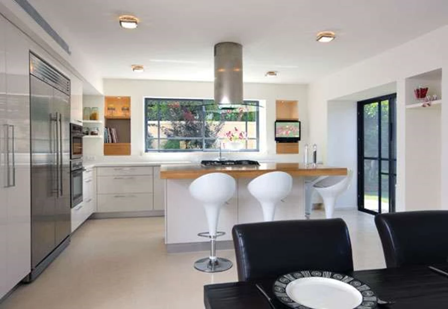 המטבח: מרחב נוח המשלב יחידת ארונות תחתיים, יחידת קיר המאכלסת בתוכה את מכשירי החשמל, ויחידת אי גדולה במרכז החלל . "מטבחי סמל".