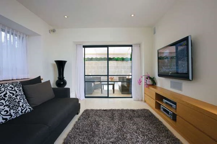 "הסלון הקטן" / פינת המשפחה שבמפלס הכניסה. עיצוב בגווני שחור לבן מוקפד ונוח כאחד, לבילוי משפחתי בצוותא. נגרות: "נגריית ששינוי"מפלס הכניסה נותר "בגדול" כשהיה לפני שיפוץ בית, כאשר תוספת של אלמנטים מבניים שונים שדרגה את חזותו ואף את הפונקציונאליות שלו. כך, למשל, באזור המבואה, שטרום השיפוץ השתרע כמרחב פתוח ללא כל הפרדה בינו לבין אזור "הסלון הקטן"/פינת משפחה המצוי מימינו, כעת לאחר שיפוץ בית נבנה קיר המגדיר אותם כשני אזורים, ובתוך כך משווה לפינת המשפחה יתר אינטימיות ואף מנוצל לשילוב ארון מלתחה נוח. לאותה מטרה נבנו גם שלושה עמודים המפרידים בין פינת המשפחה וגרם המדרגות, מסייעים אף הם לתיחומה האינטימי ומייצרים עניין צורני.