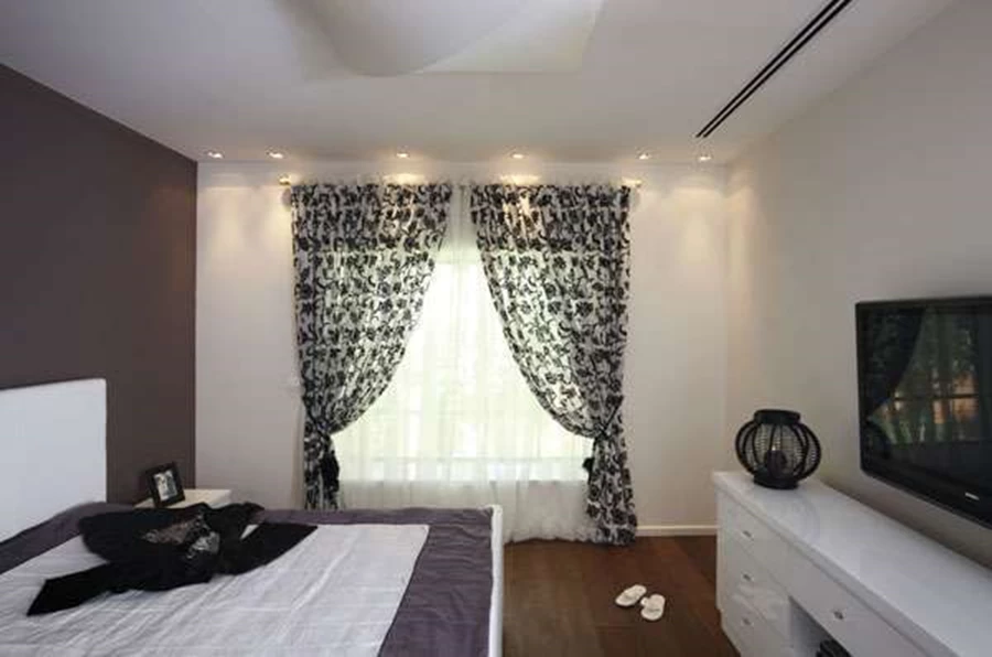 יחידת השינה במפלס הביניים. ריצוף בפרקט אלון טבעי מוברש, ועיצוב בגווני שחור לבן עם תוספת של עניין שונה שמעניק קיר בסגול חציל.