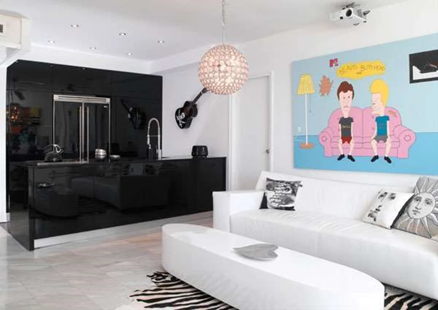 המטבח שבחלל הסלון: עיצוב על טהרת גון שחור במרקם מבריק, וקריצה שמעניקה גיטרה מעוטרת בסמל פיראטי על הקיר. מטבח: "סמל".פינת הישיבה המסוגננת שממוקמת מול מסך הקרנה של מערכת קולנוע ביתי, מגלמת את צדו העכשווי - ממותג של העיצוב: ספת עור לבנה בקווי עיצוב מעוגלים שעליה פזורות כריות של המותג היוקרתי "פורסנטי",שולחן צד עליו ניצב גוף תאורה אייקוני שעיצב פיליפ סטארק לחברת "קרטל", שולחן קפה אובלי בגימור אפוקסי לבן, שטיח עור פרה בדיגום זברה, וגוף תאורה תלוי שעיצובו ככדור קריסטל מזכיר את גופי התאורה שרווחו בדיסקוטקים של שנות השישים- שמונים. את זריקות הצבע יחד עם אווירה צעירה ועכשווית, מעניקים לחלל ציורים גדולים של אליאור: פאזל צבעוני של ברבאבא על קיר אחד, דמויותיהם של "ביבס ובטהד" מערוץ MTV על קיר אחר, ומשהו על האמירה האישית שמובילה את שפת העיצוב אפשר ללמוד גם מנוכחותו של פריט דקורטיבי בדמותו של מגדל אייפל - מודל שהרכיבו אליאור ודן ושיבצו, כמובן, באבני סוורובסקי.