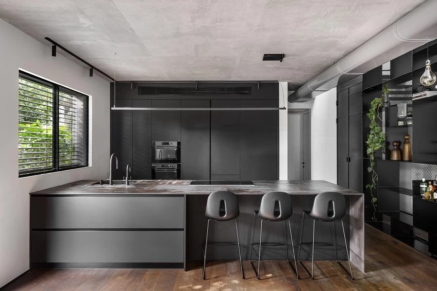 ואכן, המפגש בין שני סגנונות העיצוב נוכח בכל פינה בבית; כך למשל פוגשת תקרת טיח הבטון בחלל הציבורי את המטבח שחופה חזיתות ננו בצבע שחור מט חלקות, ורצפת פרקט האלון המיושן שמשתלבת נפלא עם הקירות הלבנים- שני עולמות תוכן שונים שיחד מייצרים כסות מעודנת והרמונית.