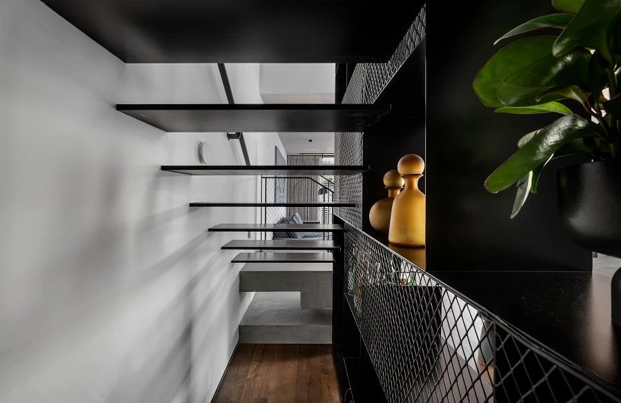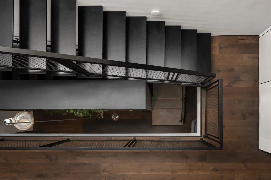 בדומה למרבית הבתים שהינם חלק ממבנה דו-משפחתי, גם בבית זה הקיר הגובל עם בית השכנים נטול פתחים וחלונות. הורוביץ השכיל לתכנן בקרבתו את גרם המדרגות וספריה מונומנטלית שחודרת את הקומות ויחד הם מהווים את עמוד השדרה של הבית. "האזור הזה הוא ללא ספק ה-FOCAL POINT ואת הגרם הזה חווים מכל קומה בצורה קצת אחרת. נתתי לו משקל לא קטן בתכנון והתחושה שמתקבלת היא שהבית נבנה סביבו".