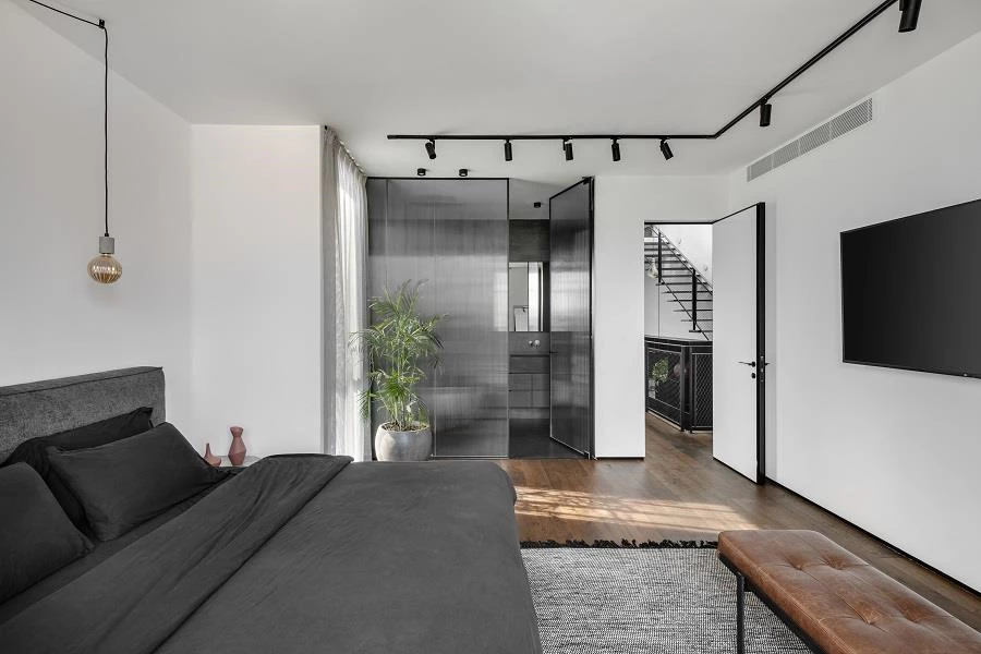חדר הארונות פתוח לאזור השינה שבינו לבין חדר הרחצה חוצץ קיר זכוכית שמאפשר העברת אור ומאידך שומר על פרטיות: "גם כאן השתמשתי בגוונים של שחור כדוגמת ארון האמבט שחופה פורניר שחור ולו רגלי ברזל, חיפויי הקירות, הברזים ופרופיל המקלחון גם הוא שחור. השתמשנו במעט חומרים וכך יצרנו מראה מאוד נקי".