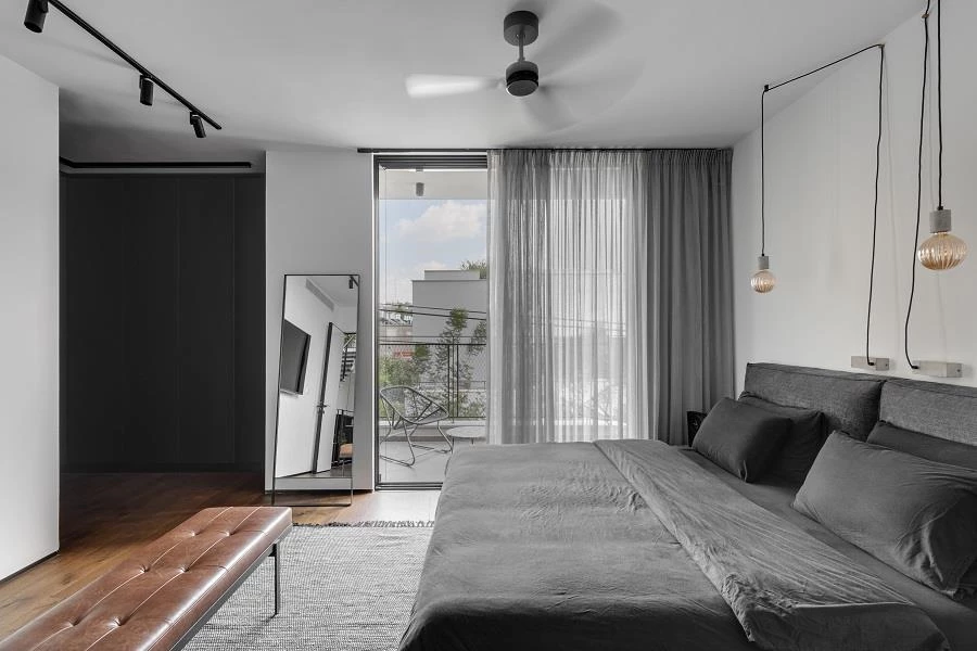 מאסטר ההורים, ששטחו כ-35 מ"ר וכולל גם מרפסת פרטית, עוצב בצבעוניות וחומריות זהות לאלה של כלל הבית. הורביץ תכנן עבור בני הזוג חדר שינה מרווח, חדר רחצה וחדר ארונות פתוח. "נשארתי נאמן לחומרים ולצבעים בכדי להמשיך את סיפורו של הבית, מתחילתו ועד סופו. חדר הארונות מזכיר מאוד את המטבח בקומת הכניסה והמיטה את הספה בסלון. השמירה על חומריות זהה וגוונים מונוטוניים יצרה מרחב מאוזן ומרגיע. הצמחייה והאומנות מוסיפים רובד נוסף שתורם לתחושה שביקשנו ליצור".