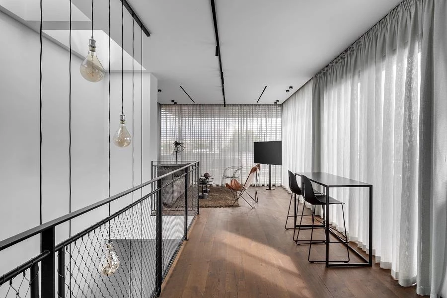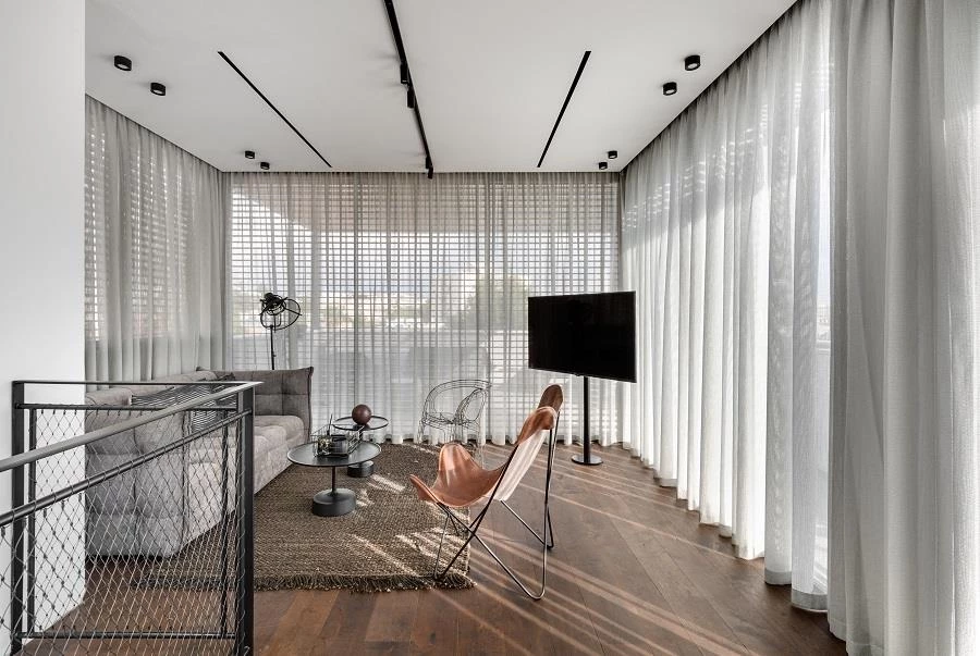 עם העלייה לקומת המגורים, שם מצויים מאסטר השינה של ההורים, אזור שירות והסוויטות של שניים מהילדים, נגלית פינת המשפחה ובהמשכה מרפסת: "יצרנו עבורם נקודת מפגש שמאחדת את כולם, סלון לכל דבר", מסביר הורוביץ. "בקומה הזאת ההנמכות מצויות רק בחדרי הרחצה והמסדרונות, כך הצלחנו להותיר את החללים העיקריים בגובה של 3 מטרים. בדומה לקומות האחרות, גם קומה זו מנוצלת עד תום; אין שטחים שאין להם שיוך פונקציונלי. הצלחנו לייצר עבור כל אחת ואחד מהם אתנחתות פרטיות ואינטימיות ופינת המשפחה היא נחלת כולם".