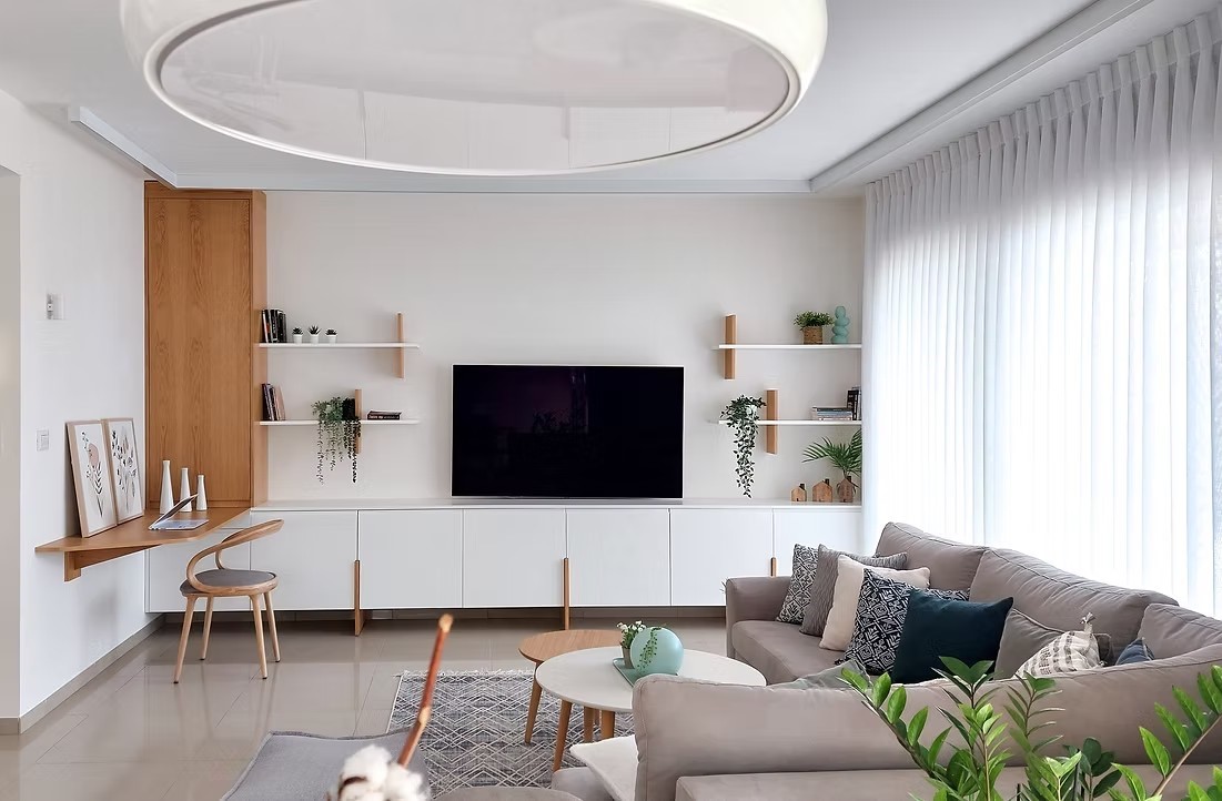 יחידת נגרות בקיר הטלוויזיה משלבת שולחן עבודה מינימליסטי מרחף וכוללת פתרונות אחסון למדפסת ולקלסרי עבודה שיאופסנו חזרה בסוף יום העבודה. "הנשיות מתבטאת ברב-שכבתיות שלו. זוהי נשיות שמבינה שבית הוא לא רק מוזיאון אסתטי אלא זירה שתומכת בחיים עצמם. היכולת לרכך קווים מודרניים בעזרת טקסטיל, עציצים ונגיעות עץ, יחד עם תכנון חכם שמאפשר לאישה להגשים את עצמה מקצועית במרחב המחיה המשפחתי, היא הביטוי הכי חזק של כוח נשי בעיצוב".