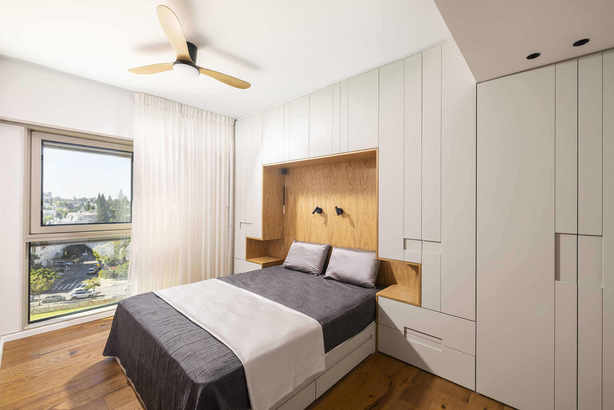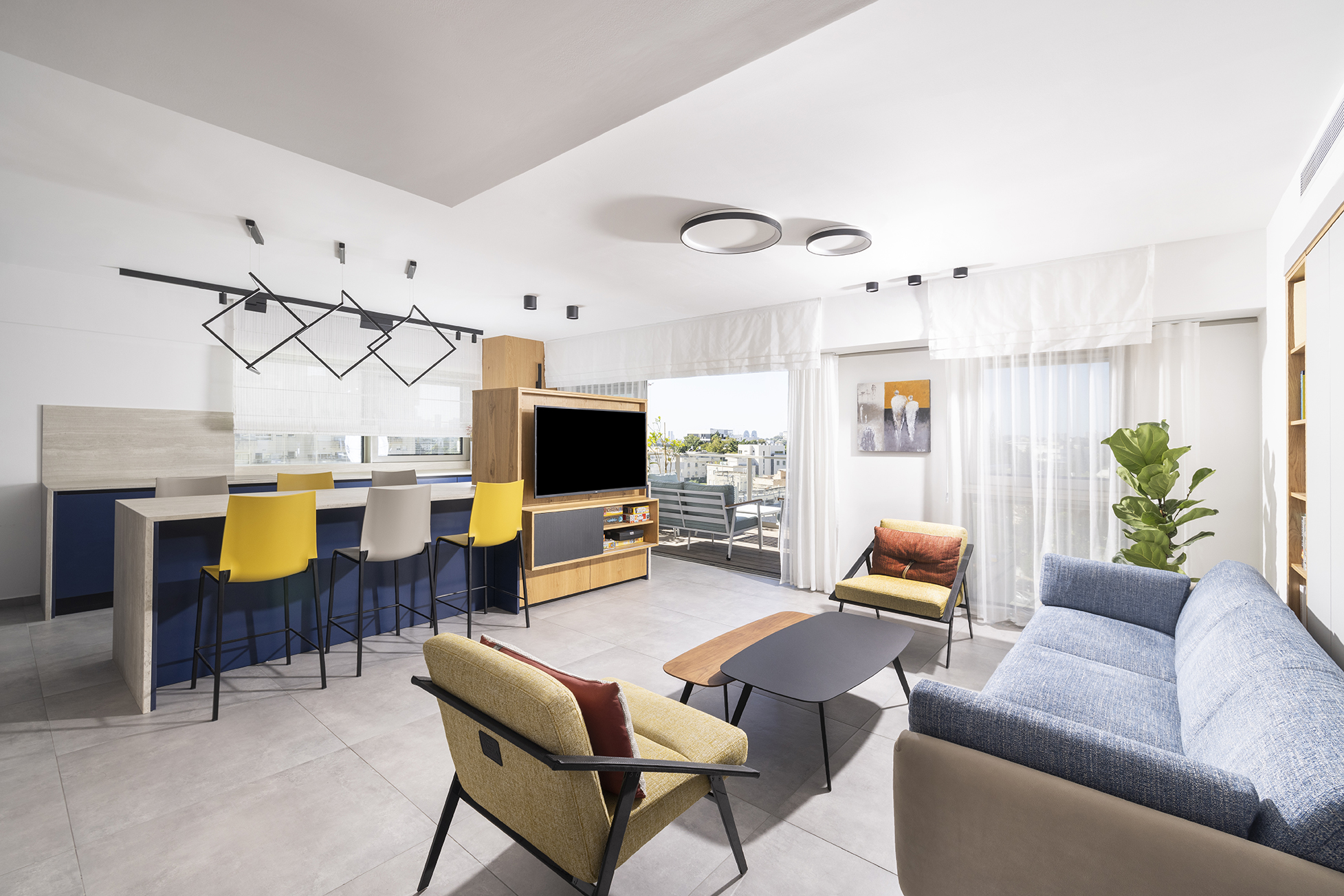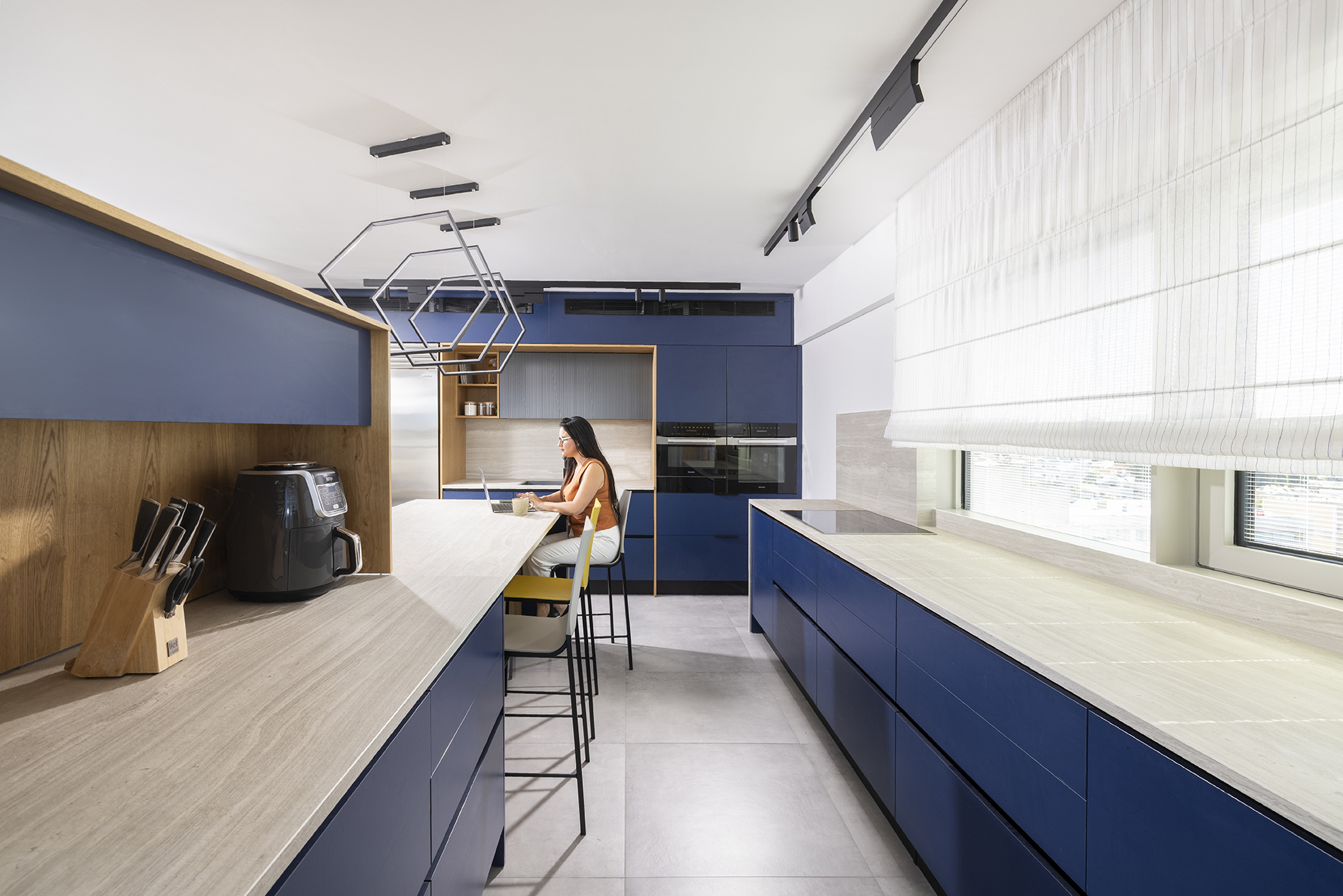 מאחר שבבנייה המודרנית לבניינים רבים יש חלונות על כל הקיר והתריסים הם פנימיים בין הזכוכיות, נדרשה חשיבה יצירתית לתכנון חשמל ומיקומי הריהוט השונים. במטבח למשל נוצר קיר הפרדה בחלק התחתון של החלון באזור הארונות התחתונים של הכיריים, וכך משטחי העבודה גדלו והחלל נוצל בצורה מיטבית.