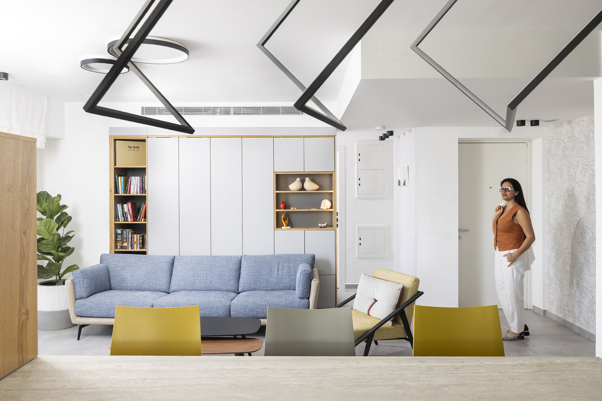 אור טבעי רב בדירת חמשת החדרים אפשר הקמה של "קירות" לצורך ניצול החלל, והיותם של הזוג בתחילת הדרך הצריכה תכנון מחושב גם לעתיד הקרוב