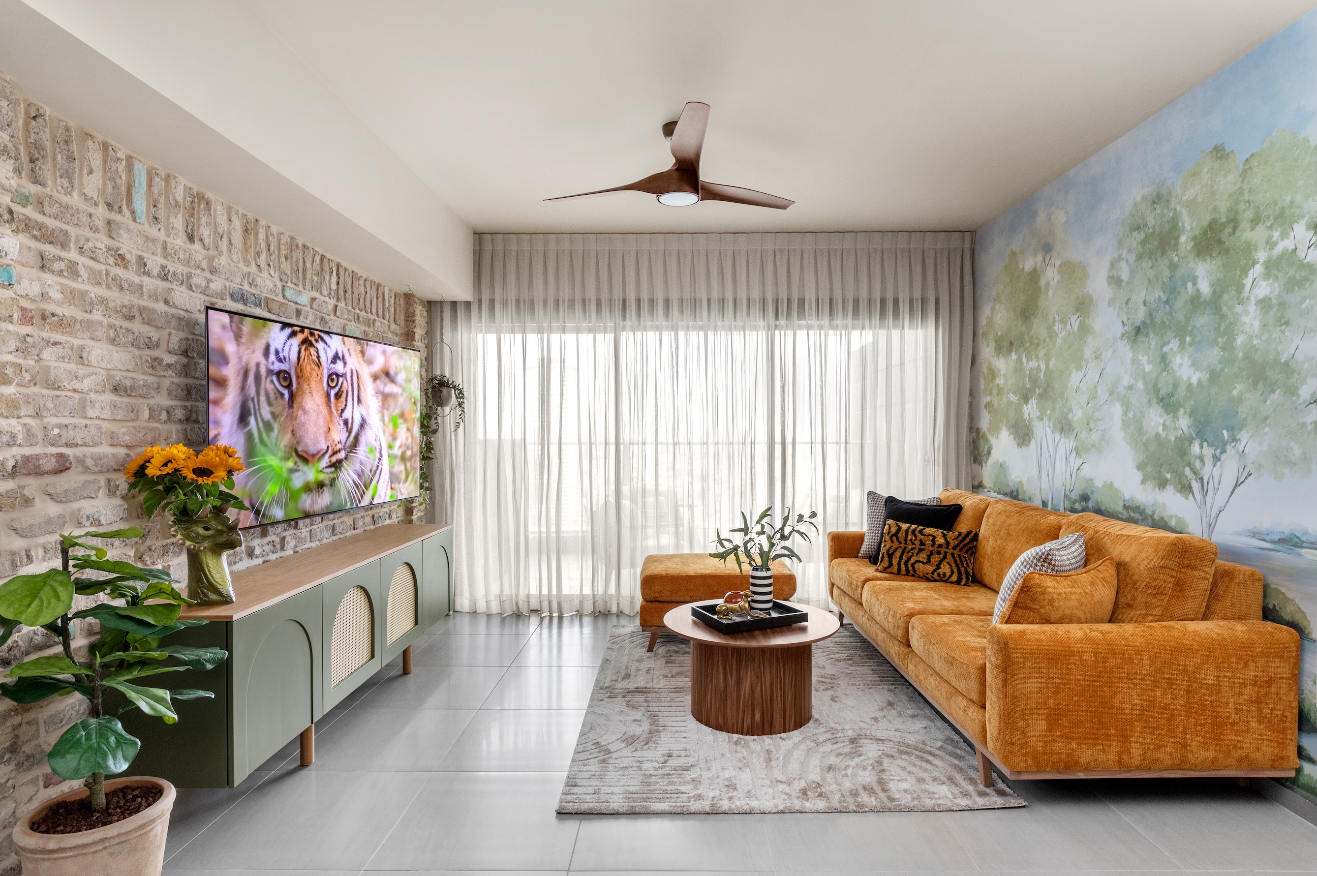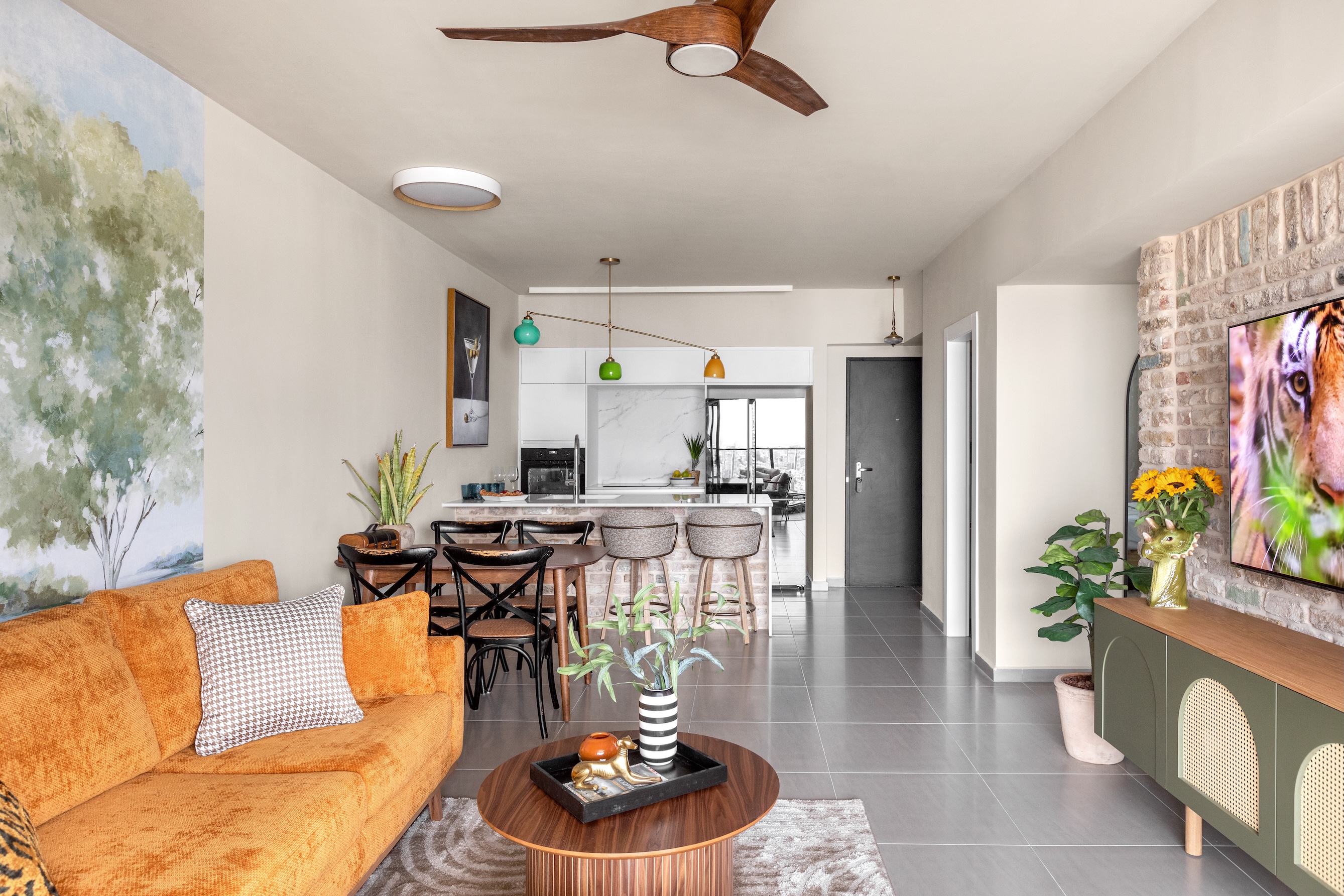 בסלון טפט של נוף רך בצבעי מים תוחם את הספה ומחלק את החלל כך שמתקבלת תחושת אינטימיות בסלון. הספה רכה בגוון נועז שבולט על רקע הנוף. קיר הטלוויזיה חופה בבריקים מפירוקים עם נגיעות צבע, ועליו יושב מזנון ירוק מענין מלא אחסון.
