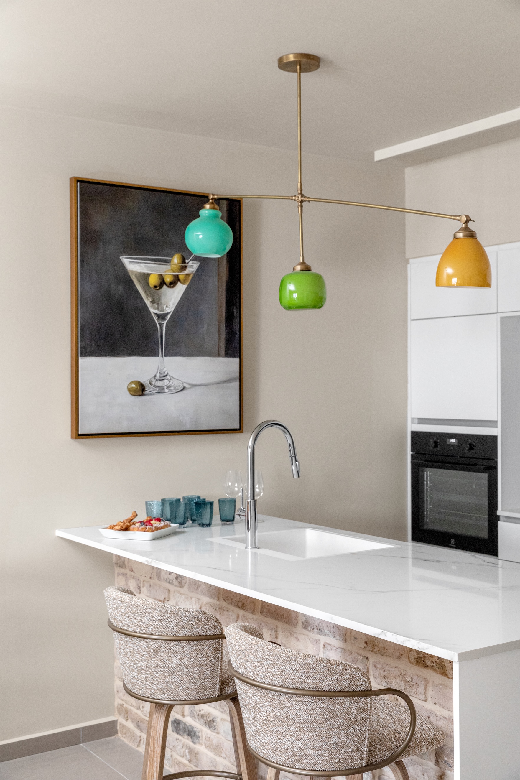 המטבח נשאר כשהיה למעט תוספות קלות. באי שחופה באותם בריקים של הסלון למראה המשכי והרמוני ויצירת טאץ' ייחודי למטבח. נבחרו כיסאות נוחים ומסתובבים לבר, ולקיר הוזמנה תמונה במידה XL. גוף התאורה תוכנן במיוחד אצל אומן תאורה והותאם לחלוקת פונקציות באי.