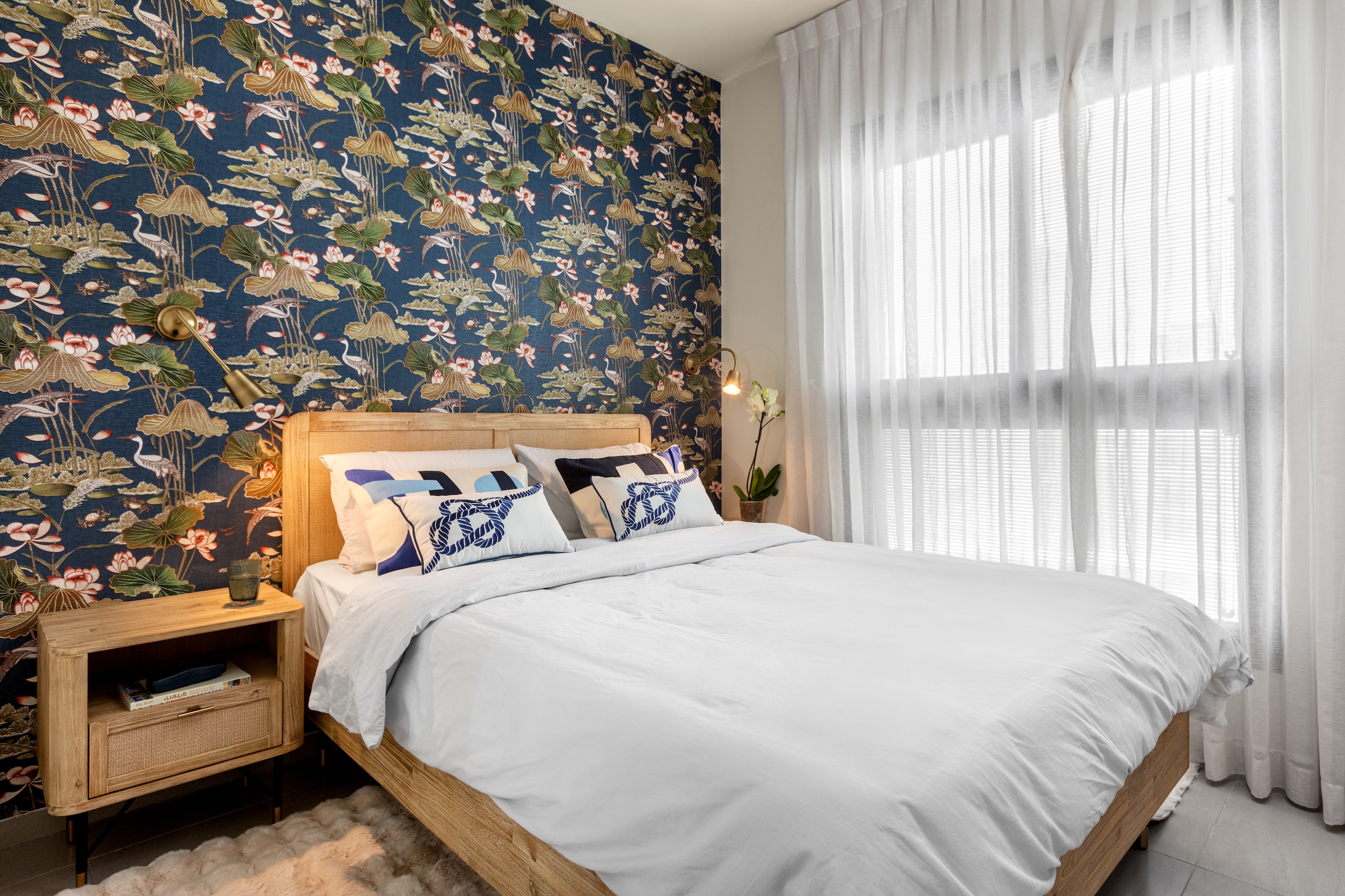סגנון העיצוב אופיין באקלקטיות בה משולבים מודרני, כפרי ויצירתי עם הדגשה של צבע וטבע. חדר השינה הראשי חופה בטפט מלא טקסטורה בסגנון יפני, ונבחר ארון קיר בסגנון כפרי קלאסי עם ידיות עץ אגוז. וילון פשתן עוטף את החלון ברכות, וגוון הקירות מוקה עמוק ואלגנטי. המסדרון קיבל מראה ענקית ששברה את המבנה הצר שלו, שטיח שמעניק תחושה ביתית וראש יען זהובה שמציצה בקצה לקריצת הומור.