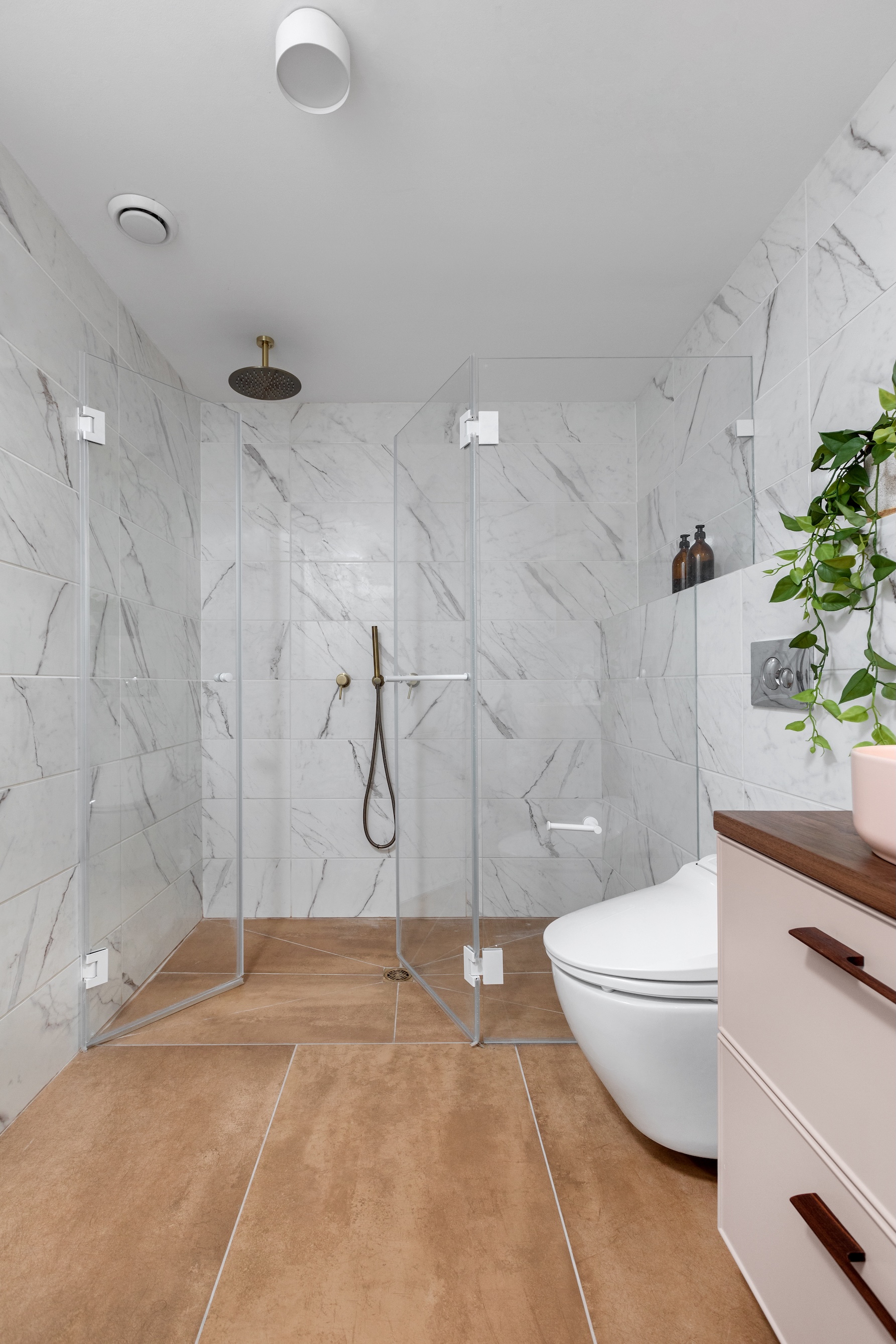 מלבישה הבתים ומעצבת הפנים מאיה בירגר, שהכירה אותו תוך כדי לימודי הדרכת טיולים למזרח, לקחה על עצמה את הפרויקט. הוא כלל הלבשה של כלל הדירה עם שיפוץ במקלחת הכללית לטובת החלפת האמבטיה במקלחון רחב ידיים. לחלל הוזמן ארון מקלחת גדול שיכלול גם את אחסון הכביסה, כך שניתן להושיט יד, להכניס את הכביסה ולשלוף אותה בקלות.