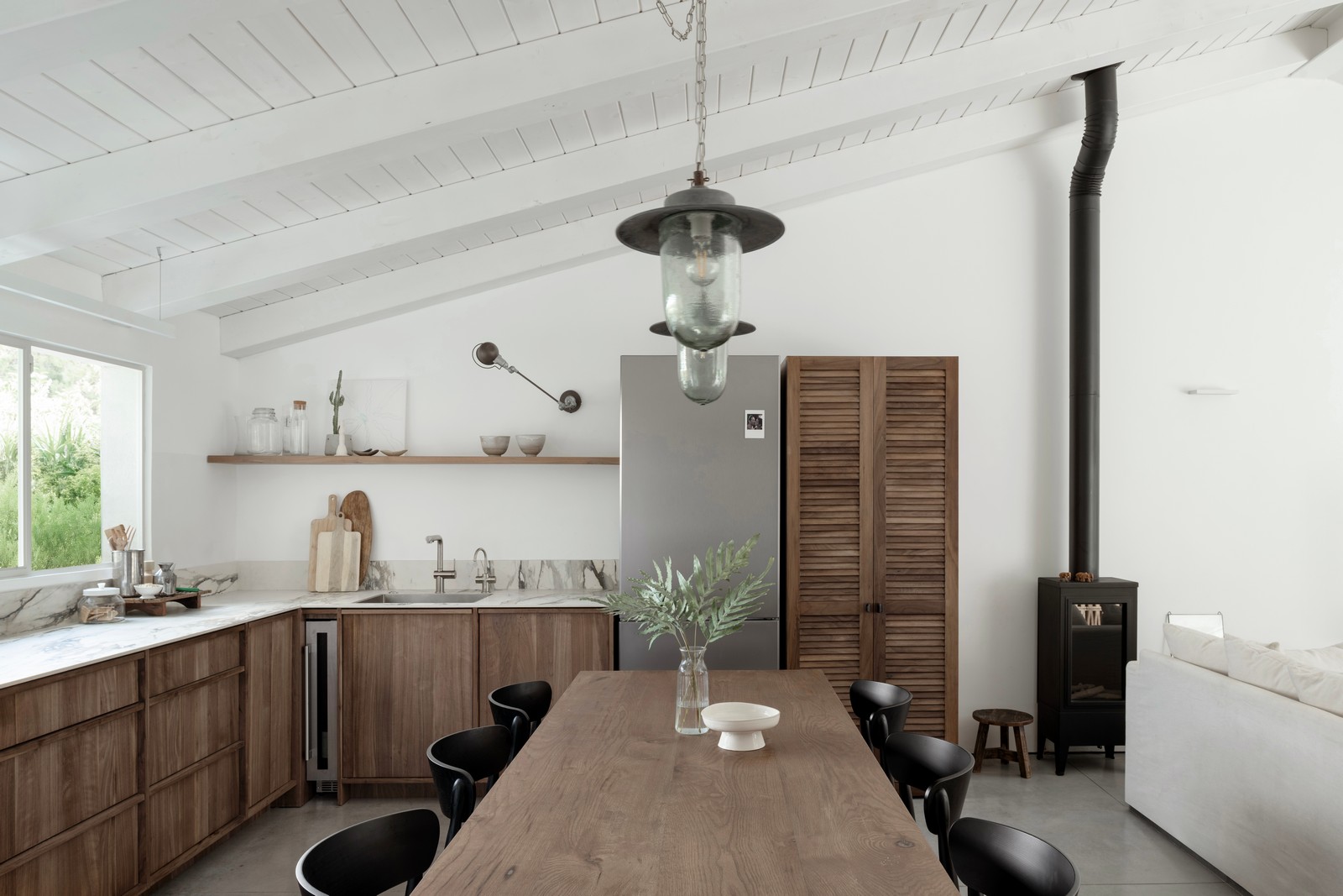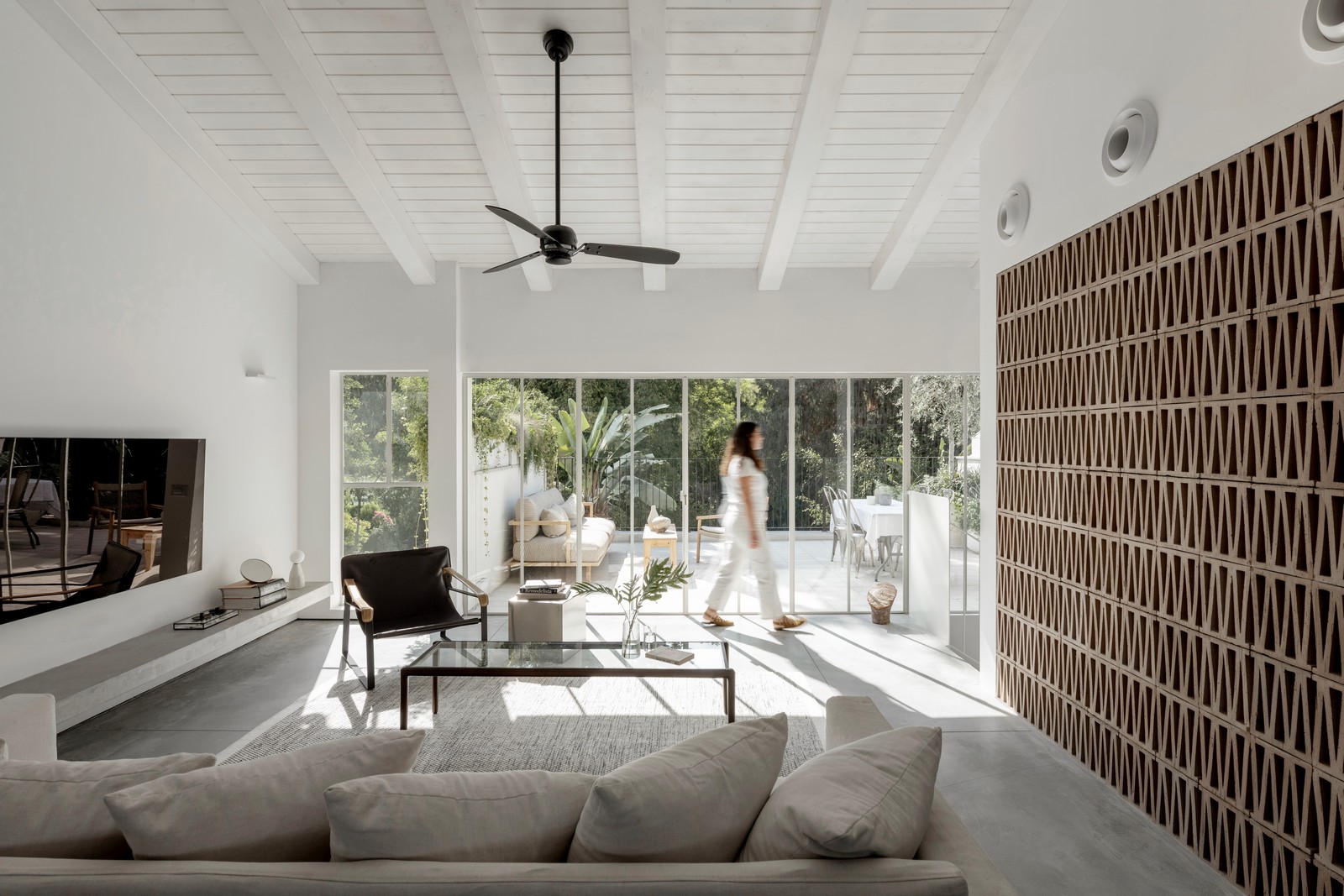 בסלון מתחת לטלוויזיה תוכנן מדף בטון צף ארוך, וספה גדולה פונה למרפסת. בתחילת הדרך הוצג בפני בעלי הבית הרעיון שהסלון יכול לפנות לכל הכיוונים ולהתכנס בחלל, וכך יוכלו לגוון ולרענן כשירצו. פינת אוכל עוצבה קאסטם מייד ומוקמה בין הספה למטבח, כך שהיא לא מרגישה בתוך המטבח אלא בחלל הכללי. גם ארון התריסים לצד המקרר מוסיף לתחושה שפינת האוכל כביכול מנותקת מהמטבח.