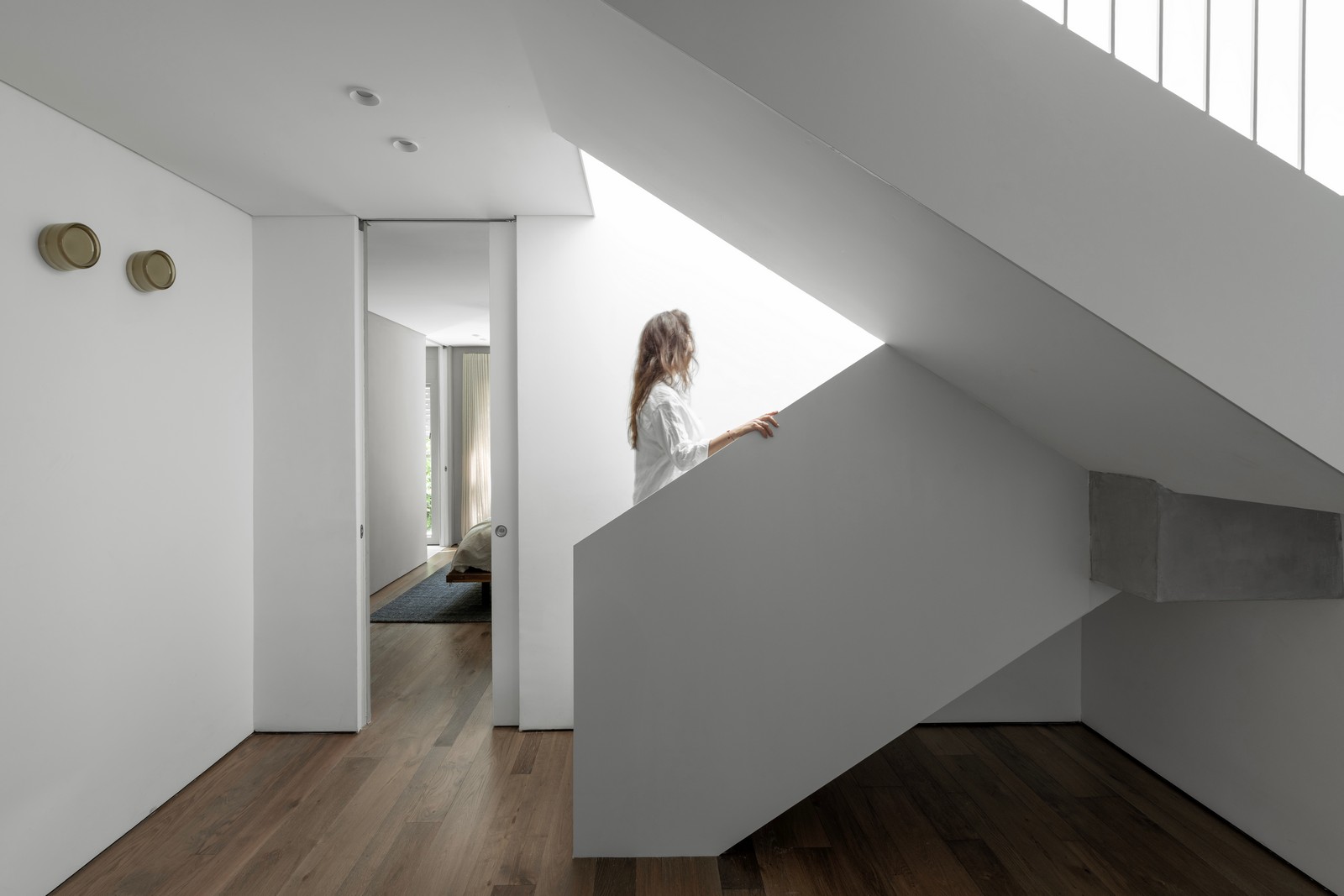 קומת חדרי השינה מטופלת בדלתות גבוהות במיוחד מרצפה עד תקרה למראה אלגנטי, והניתוקים בין הפרקט לקיר ובין הקירות לתקרה משווים מראה אלגנטי ומטופל של קירות גלריה. הפרקט בגוון כהה ומקורו מפירוק, והפלנקים בעוביים ואורכים משתנים למראה גס יותר אל מול ניקיון הקירות. בקומה יש מאסטר הורים עם מבואת הלבשה מפוארת, שלושה חדרי ילדים וחדר רחצה כללי. באזור המשותף ארון גדול ובתוכו מכונת הכביסה והמייבש, וארון ענקי שמכיל צעצועים ומשחקים.