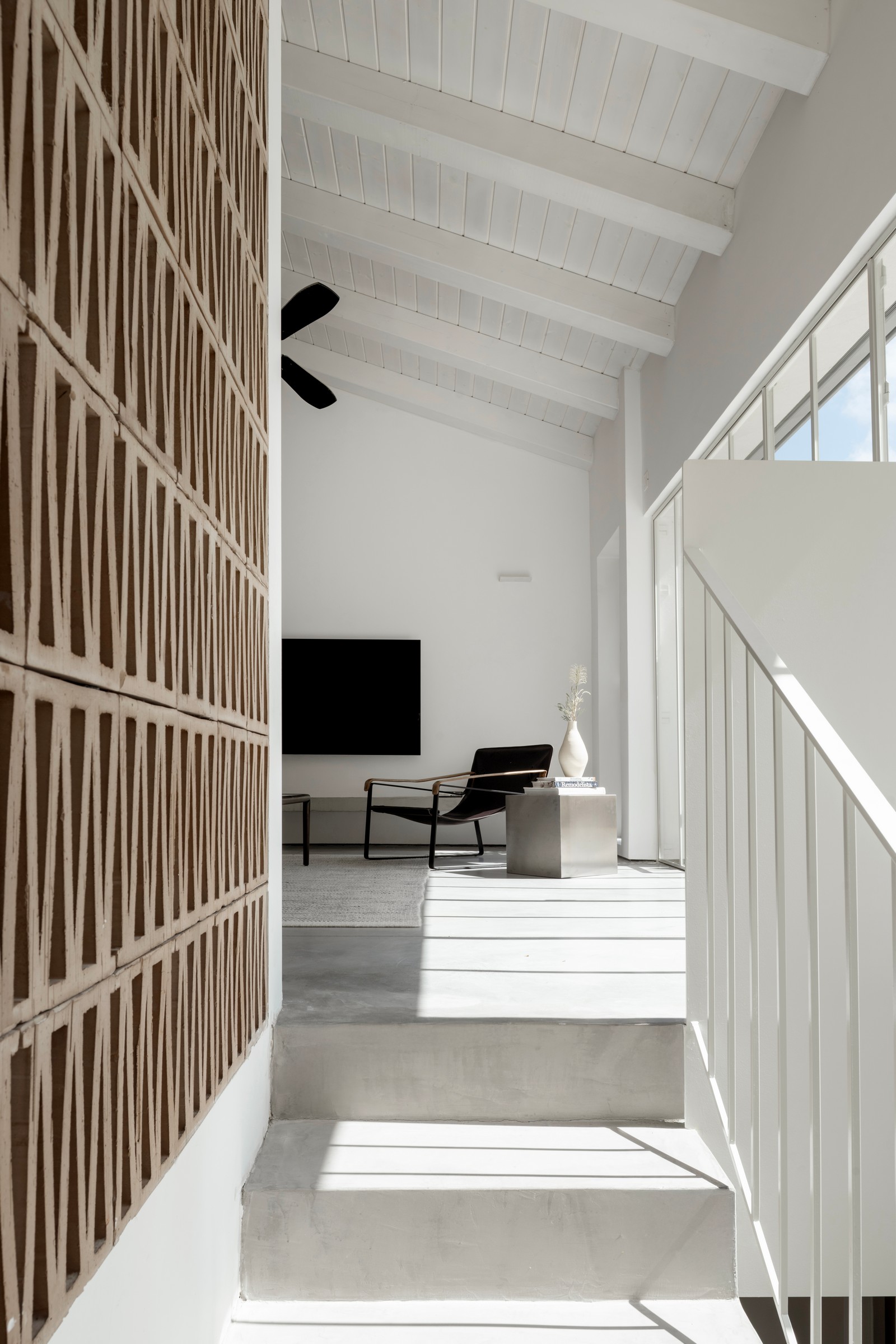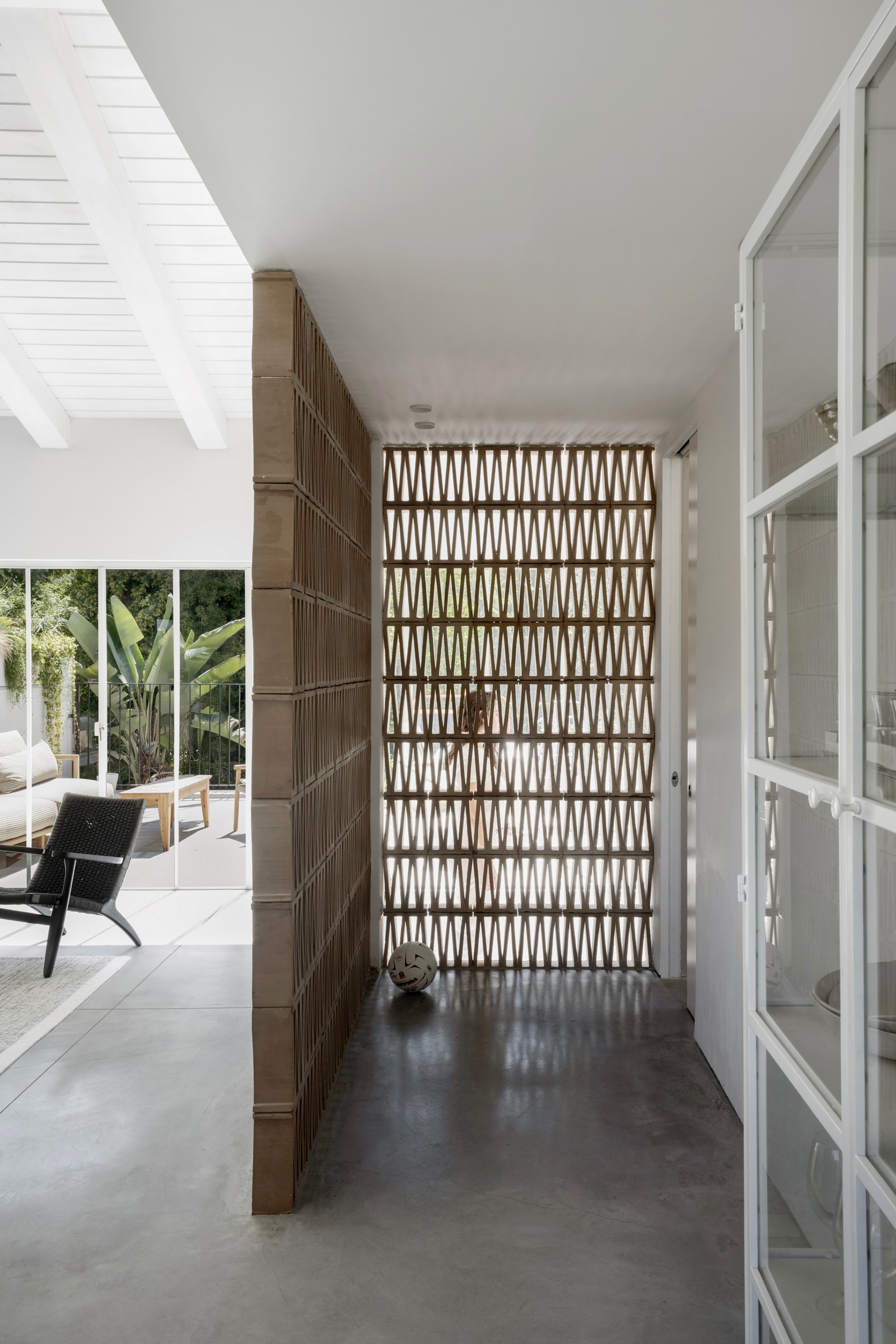 קיר משרבייה מטרקוטה ונגרות מאגוז אפריקאי משרים חום בבית בהיר ועל זמני של זוג רופאים. קומת המגורים התחתונה היא דווקא זו שנכנסים דרכה לבית, וגרם פיסולי מוביל לקומת האירוח המודרנית והמזמינה