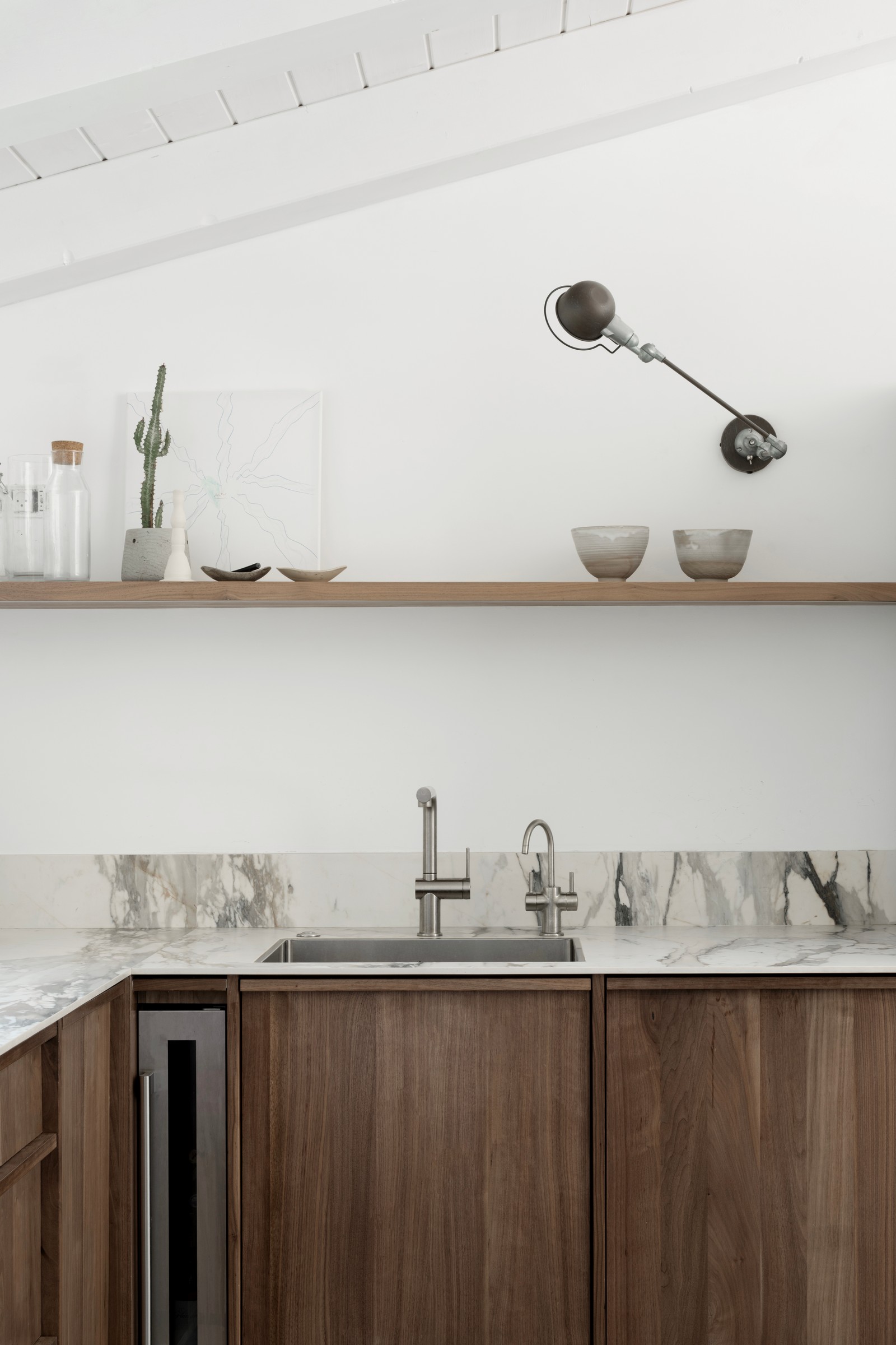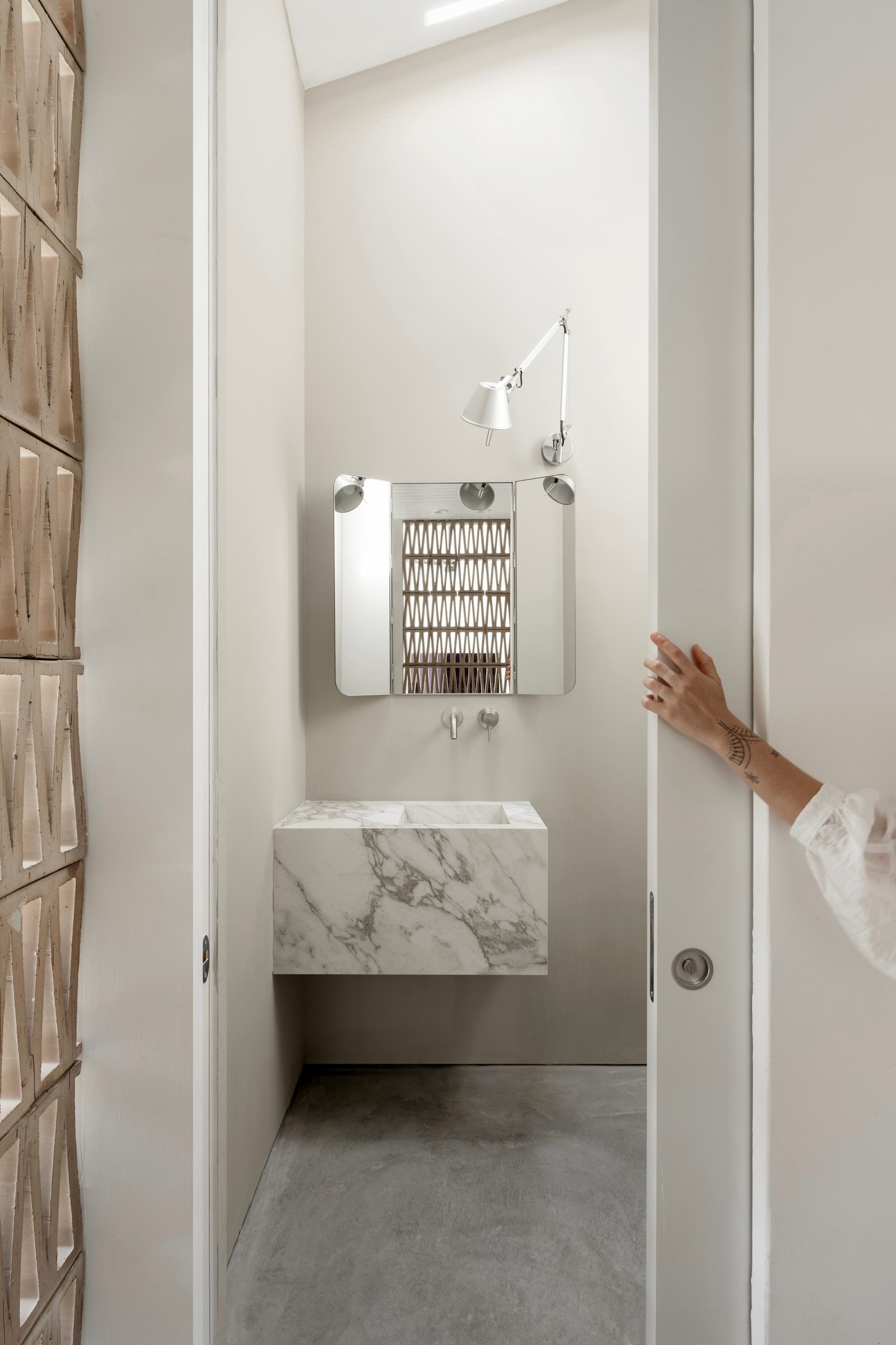 התחושה הכללית בחלל היא שמדובר בפנטהאוז ולא בדירה דו קומתית. התקרה משופעת ונגרות המטבח לא מגיעה עד התקרה. בתקרה לא מוקמה תאורה, מלבד פינת האוכל. התאורה שנבחרה היא קירית בלבד כדי להשרות אווירה נעימה, מזמינה ובעיקר להעצים את התקרה. מאחורי המשרבייה מסתתר מעבר פרטי לשירותי אורחים, אשר בהם קוביית כיור משיש משולב עם מראת טריפטיך (שלושה חלקים) שמשקפת את המשרבייה.