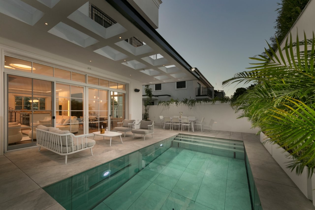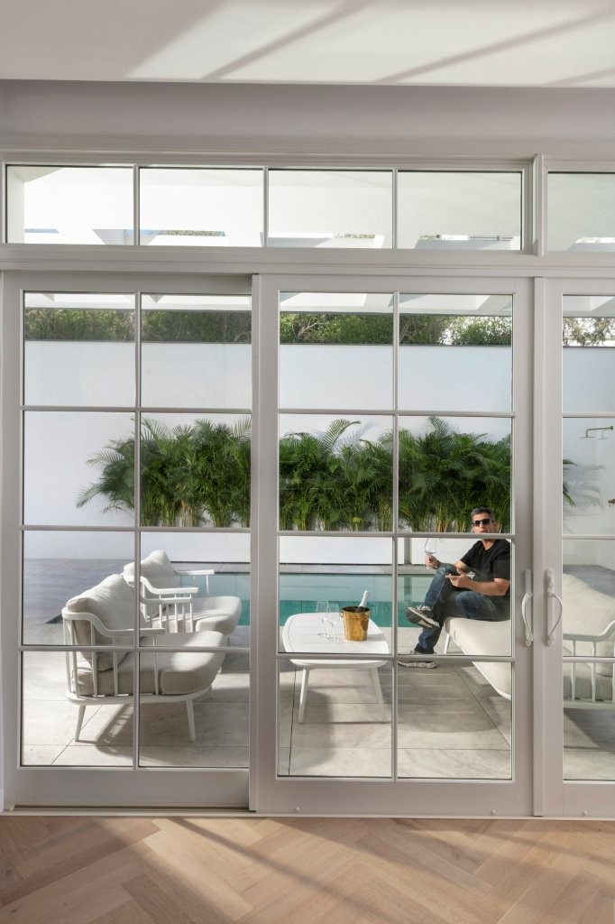 החצר תוכננה כך שתאפשר שימוש מקסימלי למרות גודלה. הבריכה כוללת במה הידראולית שעולה ונסגרת למשטח אחד, מה שמאפשר בטיחות גבוהה יותר ושימוש מלא בחצר גם כשאינה פתוחה. הצמחייה נבחרה במינון מדויק – בלי גינון כבד – וממוקמת כך שמכל חלון נשקף ירוק ולא קיר או חומה. במטבח, למשל, החלונות פונים לאדניות שתולות שמרככות את המבט החוצה.