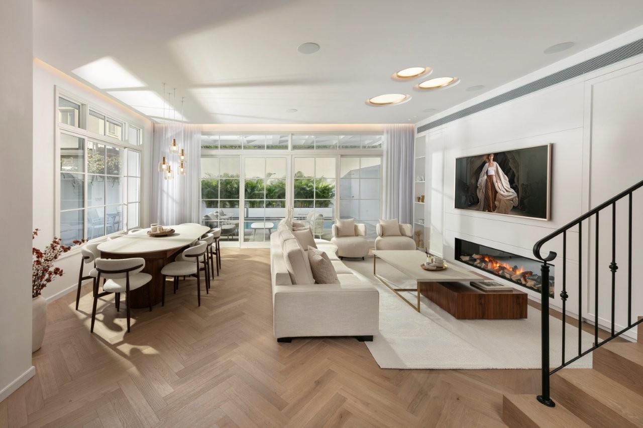 הסלון ממוקם במרכז החלל ונהנה מפתחים גדולים, כולל חלון אלומיניום שנפתח לשני הכיוונים ומחזק את הקשר עם החוץ. קיר הטלוויזיה תוכנן כאלמנט פונקציונלי ואסתטי כאחד: הוא משמש לאחסון ולפריטי נוי, ומאחוריו מוסתרות מערכות המיזוג – פתרון שמאפשר מראה נקי ובלתי מתאמץ.