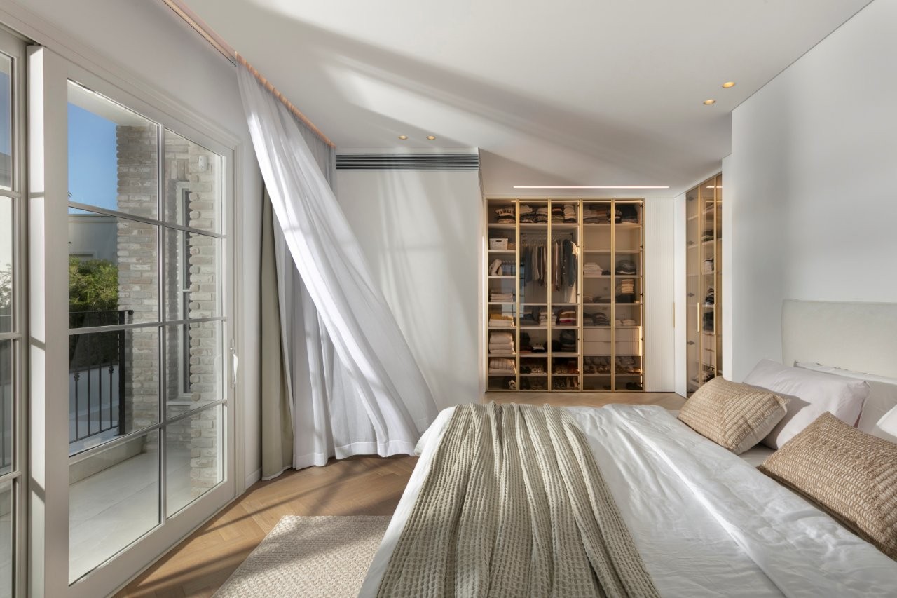 בקומות העליונות ממוקמים חדרי הילדים, כאשר לכל ילד סוויטה פרטית עם חדר רחצה משלו. בקומה העליונה ביותר תוכננה סוויטת הורים מרווחת במיוחד, עם קשר ישיר אל הבריכה. הסוויטה כוללת חלל שינה גדול עם מרפסת, וילונות לבנים ואווירה שקטה ונקייה. פינת הארונות מתוכננת כנישה דרכה נכנסים אל חדר הרחצה, שבו ארונות עם חזיתות שקופות ומסגרות מוזהבות. חדר הרחצה עצמו ממשיך את הקו האלגנטי עם חיפויי דמוי אבן וטרוורטין בהיר, פלטות דקות ומקלחון גדול שפונה אל המרפסת – מהלך שמכניס אור ותחושת מרחב גם לאזור האינטימי ביותר בבית.