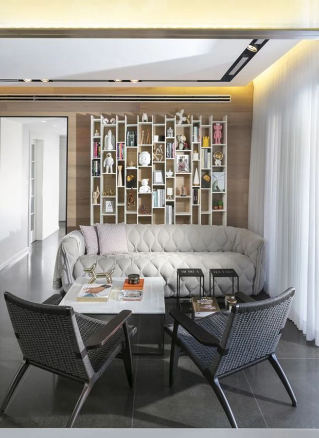 עבור הקיר האחורי בסלון תכנון המעצב ספריית כוורת עם חלוקה רנדומלית עשויה עץ וצבועה בתנור שמהווה קיר כוח ובה משולבים חפצי נוי שאספו בני הזוג במסעותיהם בעולם. ספת הקפיטונאז' המפנקת מרופדת בד ארוג בעל טקסטורה עשירה ותלת ממדית. כיסאות העץ והראטן המוצבים מולם מייצרים אווירה קלילה ופחות רשמית. שולחנות הסלון יוצרו במיוחד בשלושה גדלים וחיפויים מסוגים שונים. כל אלה משתלבים עם רצפת אבן הבזלת השחורה שמחפה את החלל הציבורי כולו.