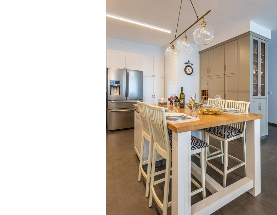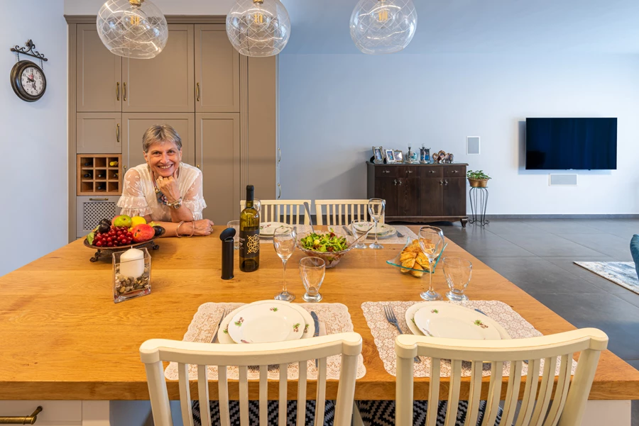 "התעקשתי בעניין הנברשת בפינת האוכל, למרות שבעלי הבית לא התלהבו בהתחלה. יש לי את היכולת לדמיין איך הדברים ייראו בסיום התהליך - והדבר מוכיח את עצמו שוב ושוב. בדיעבד, הם הודו לי, כיוון שאהבו מאוד את התוצאה. כך גם היה עם תוספת התאורה במטבח, למרות שכשהצעתי אותה הם חשבו שהיא מיותרת. כשנכנסו לגור בבית, והתחילו להשתמש במטבח, אמרו לי כמה הם נהנים ממנה וכמה טוב שלא ויתרתי בעניין".